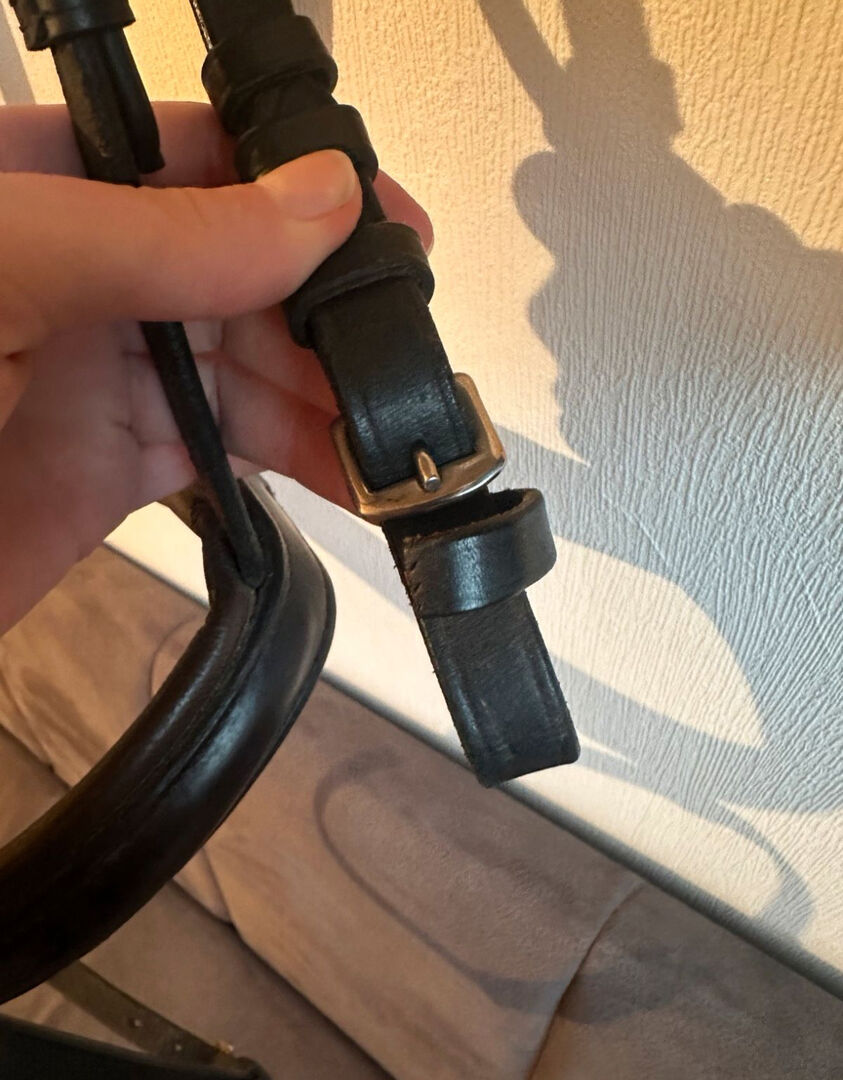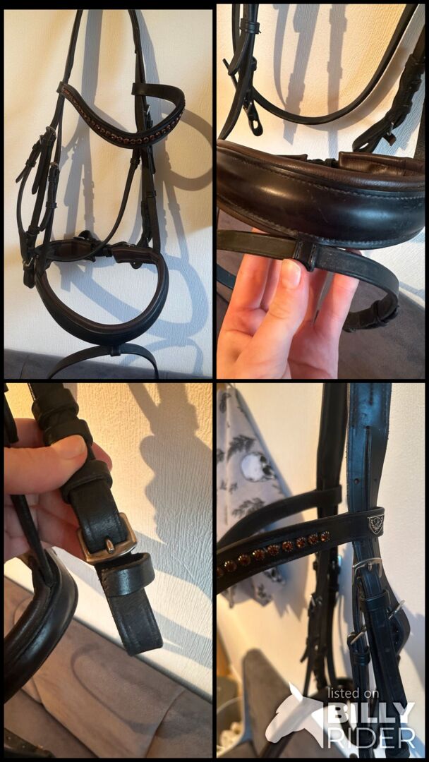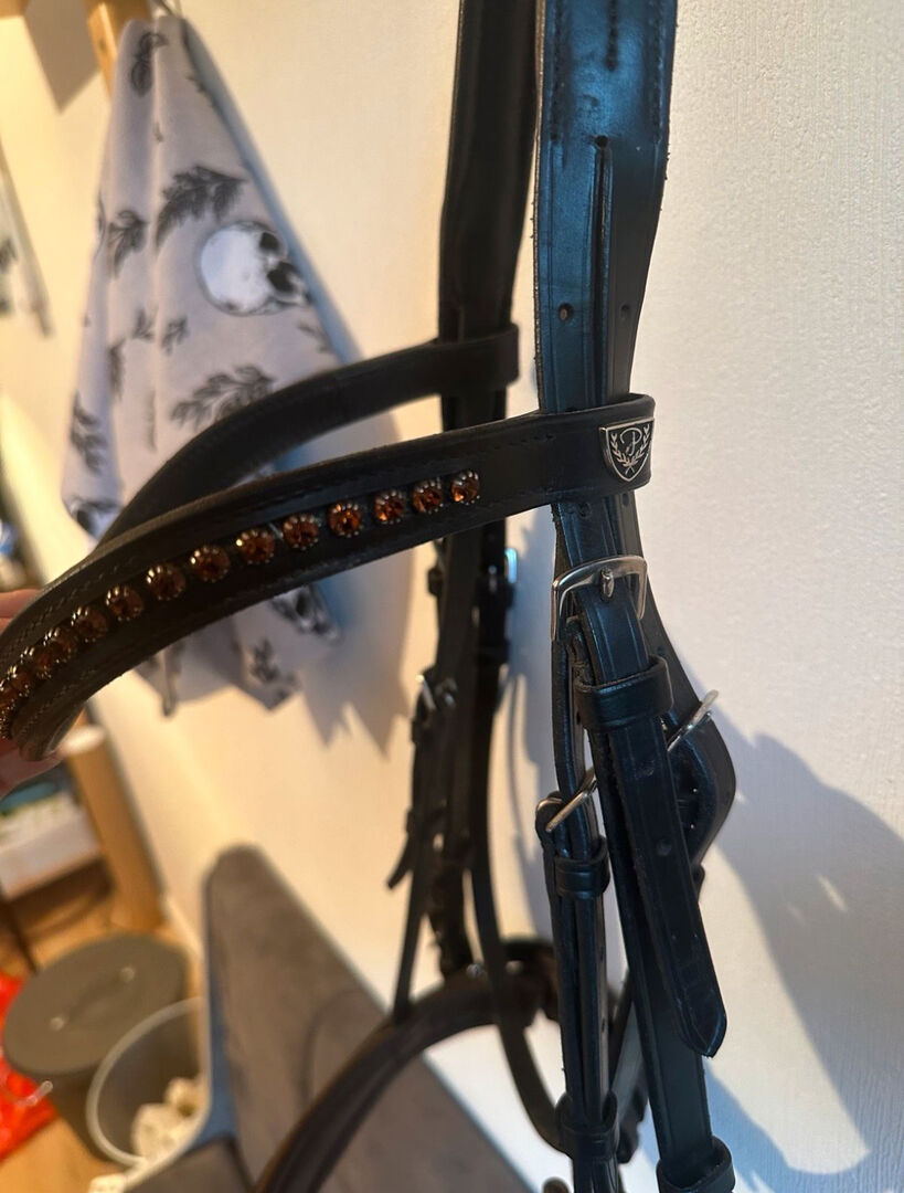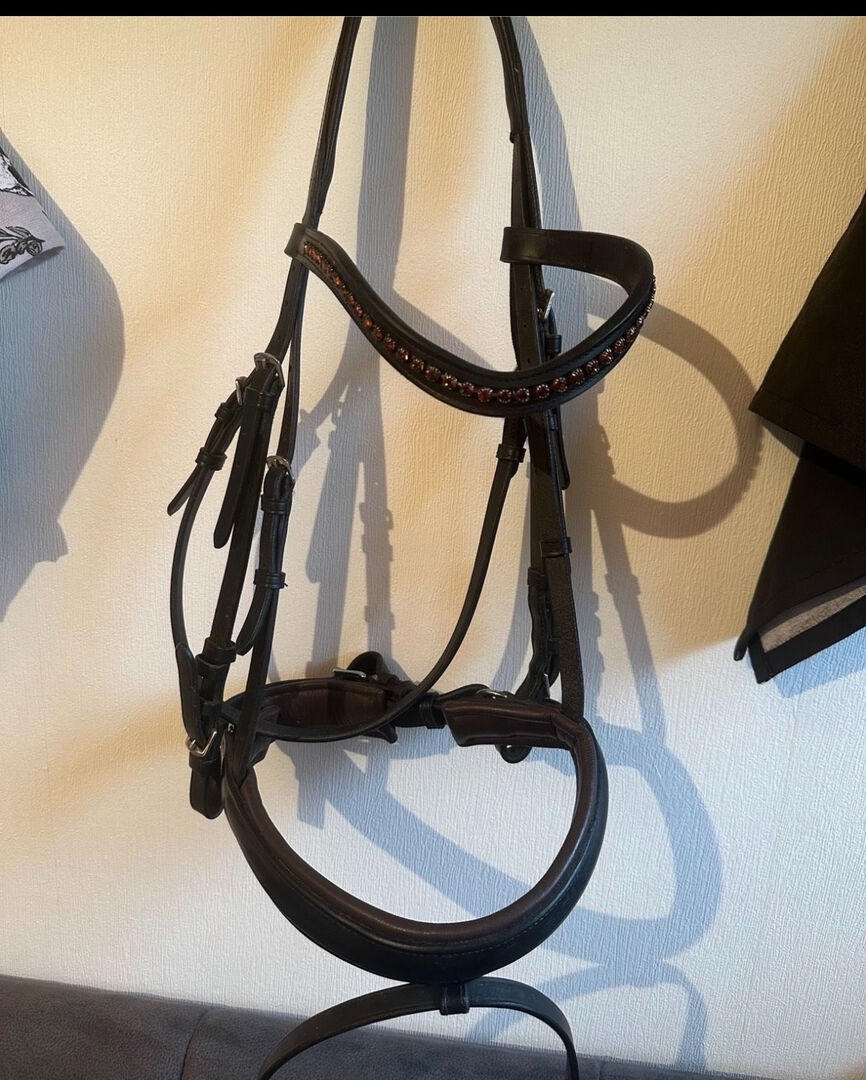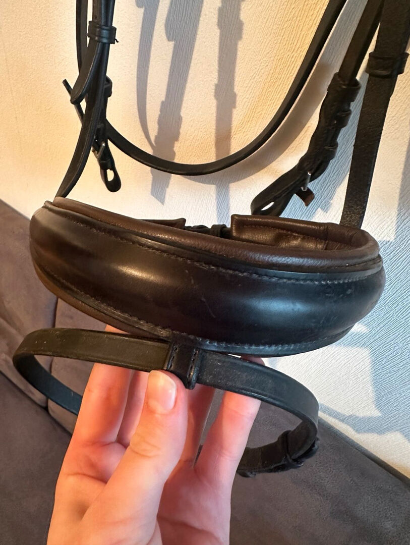 Uzda kombinowana szwedzka PFIFF WB czarna, brązowa podszewka - Sprzedaję moją rzadko używaną uzdę Pfiff w rozmiarze WB. Jest czarna z brązową podszewką. Ma również bardzo ładną błyszczącą opaskę na brwi, kamienie są również brązowe. Jest w super stanie. Niestety jeden ze skórzanych pasków na lewej sprzączce oderwał się, ale nie jest tak naprawdę używany i nie wpływa na jego funkcję.