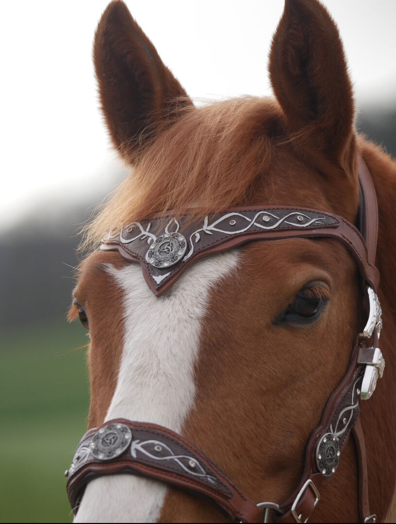 Uzda LG / snaffle unikalny Cob / Vb - Więcej zdjęć można wysłać, jeśli jesteś zainteresowany Uzda jest unikalna i została wykonana ręcznie. Niestety brakuje kilku kamieni, patrz zdjęcia, poza tym świetny stan i wykonanie. NP wynosiła 350 €. Może być używany jako uzda LG lub jako wędzidło. Sprzedawane bez wędzidła.