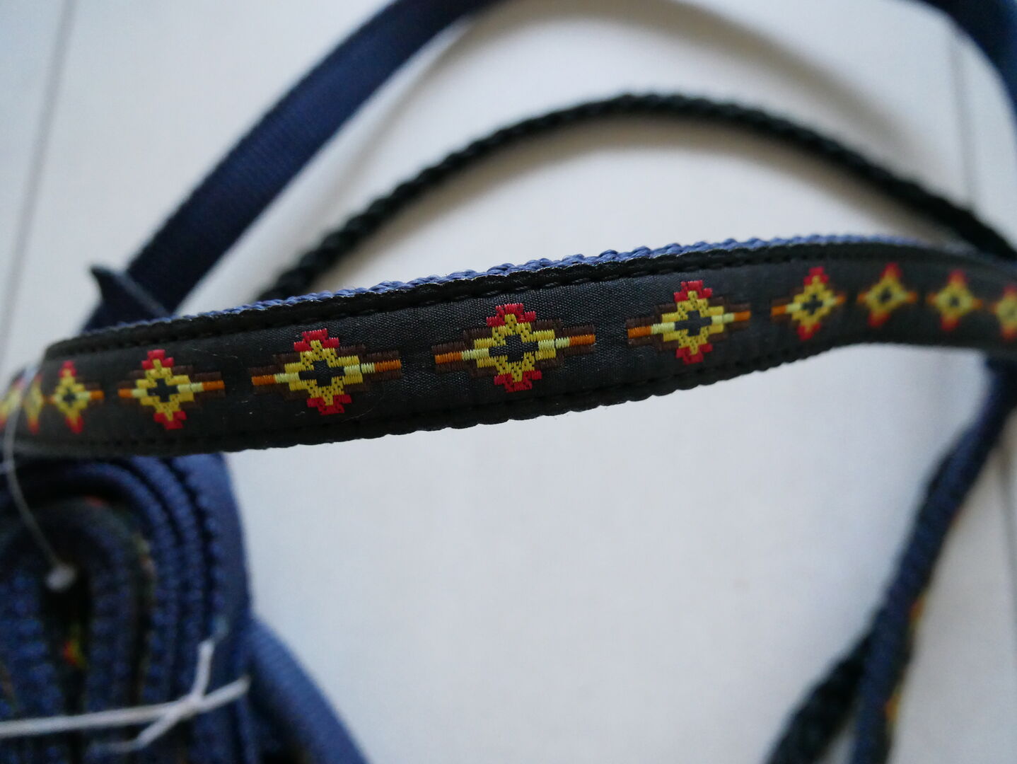Uzda podróżna ~ Uzda podróżna ~ Opaska na nos ~ Webbing/nylon ~ z lejcami - ~ Uzda podróżna/pasek na nos podróżny wykonana z taśmy/nylonu z lejcami Niebieski z wzorem rozmiar COB