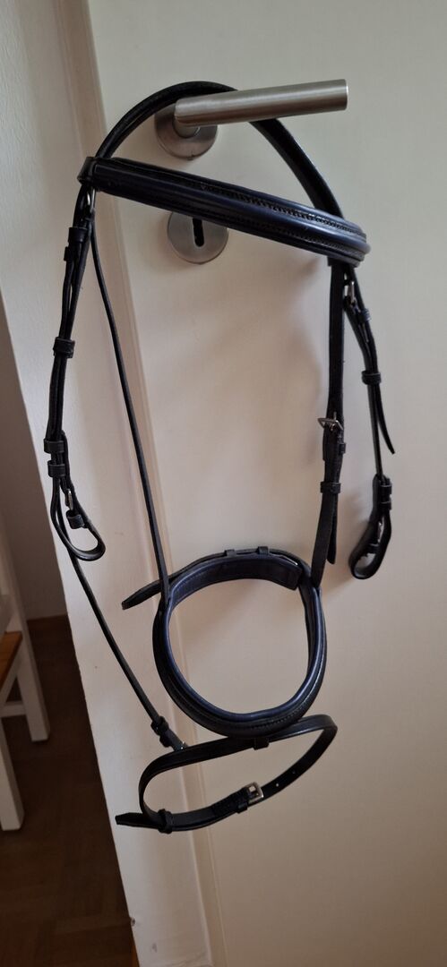 Uzda snaffle - Czarny skórzany nachrapnik z ciemnoniebieską wyściółką na nosie i na łuku brwiowym
