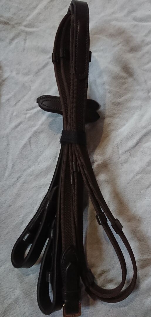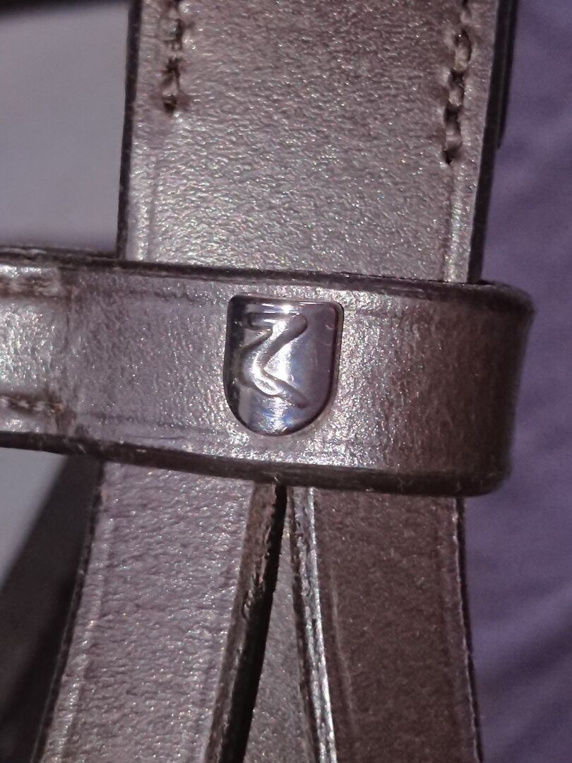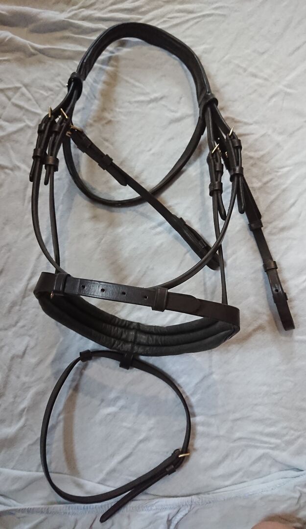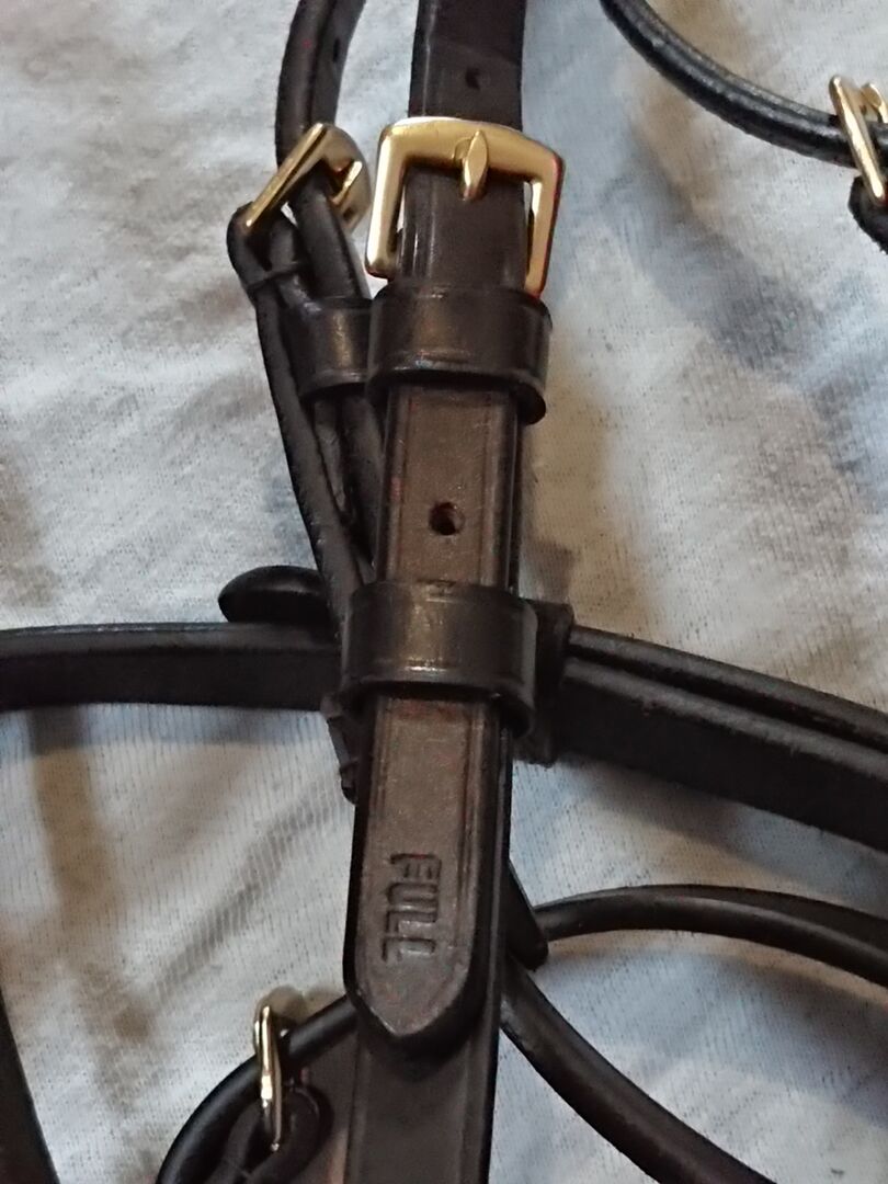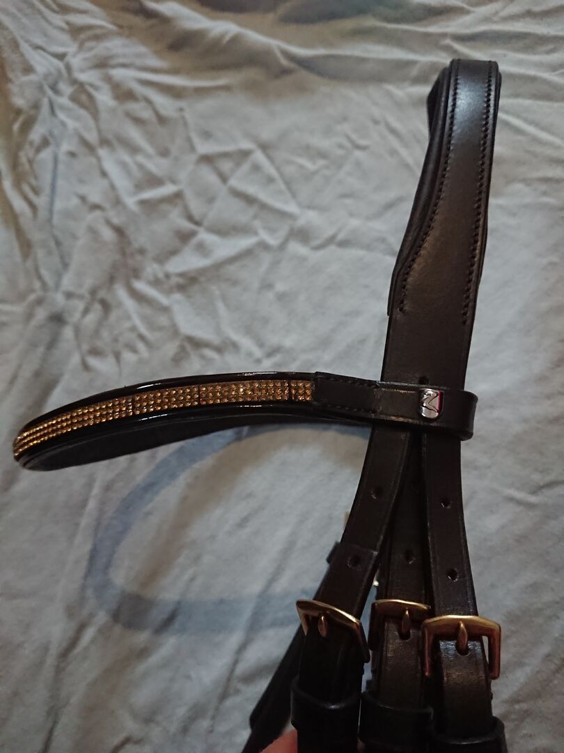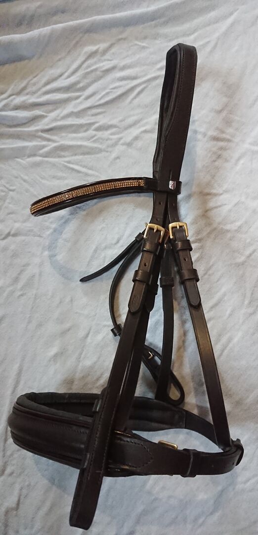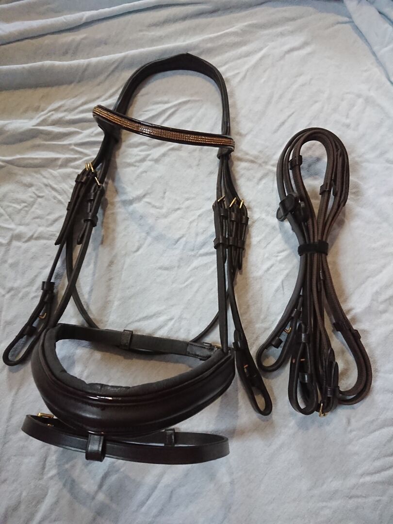 Uzda Snaffle Horze Brown pełna jak nowa - Uzda angielska typu snaffle, łączona, pętla została oderwana, ale jest w zestawie i można ją bez problemu przyszyć z powrotem. Piękny czekoladowy brąz ze złotymi okuciami. Kryształki na pasku, super miękka skóra. Pasek na nos jest bardzo szeroki, czego nie lubię u mojego konia. Pasek na nos jest regulowany po obu stronach, mocno przyszyty do boku szyi, dlatego nie tak łatwo go wymienić. Poza tym piękna uzda w świetnym stanie, lejce wciąż nieużywane. Rozmiar: Full Warmblood, pasuje normalnie.
