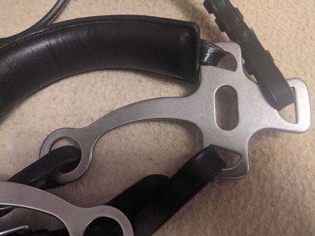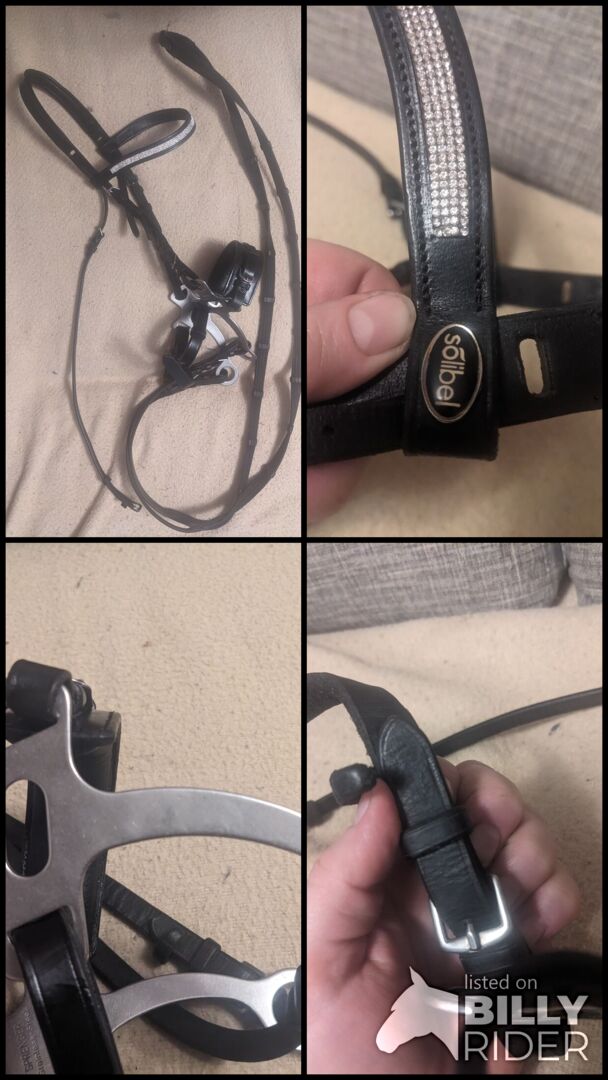 Uzda Sprenger Hackamore Solibel z wędzidłami - Rzadko używany Sprenger Hackamore w idealnym stanie na uzdy Solibel (uwaga: brak paska nosowego w zestawie, ale jak widać na zdjęciach istnieje możliwość przełożenia paska nosowego), wszystkie kamienie z pięknej opaski zachowane, w tym lejce bez zatyczki martingale (jeden mały pasek oderwany, patrz zdjęcie).
