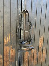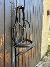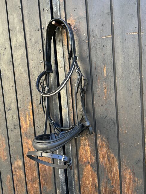 Uzda szwedzka z odpinanym paskiem blokującym (+ pętla paska blokującego) - Na sprzedaż dobrze utrzymana szwedzka uzda z odpinanym paskiem błyskowym + pętla paska błyskowego z Claridge House. Rozmiar Full