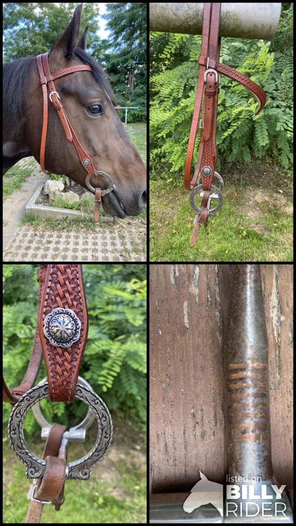 Uzda westernowa z karabińczykiem wodnym od Qualcraft - Piękna westernowa uzda z paskiem w kształcie litery V (wzór koszyka) i wodzy firmy Qualcraft (słodki żelazny ustnik). Conchas od Jeremiah Watts pasujące do uzdy