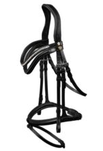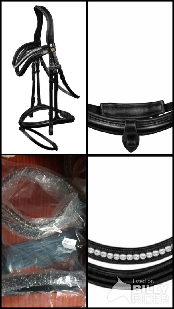 Angielska łączona opaska na nos Anatomicznie ukształtowany naczółek z odciążeniem uszu Odpinany pasek blokujący Do wyboru dwie opaski na brwi (gładka skóra i wąski kryształ) Miękko wyściełany nosek i nagłowie Okucia ze stali nierdzewnej Haczyki na uzdę ułatwiające zakładanie i zdejmowanie BEZ wodzy