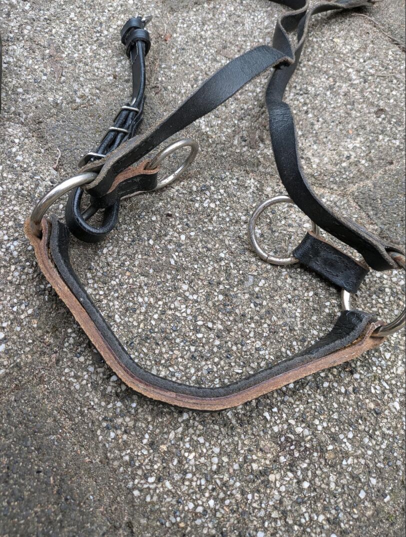Opaska na nos z ergonomicznym naczółkiem i parą wodzy jest nowa. Uzda bezgryzowa i druga para wodzy są używane, ale w dobrym stanie. Obie były przechowywane w suchym miejscu w piwnicy i z pewnością skorzystałyby na odrobinie pielęgnacji skóry.