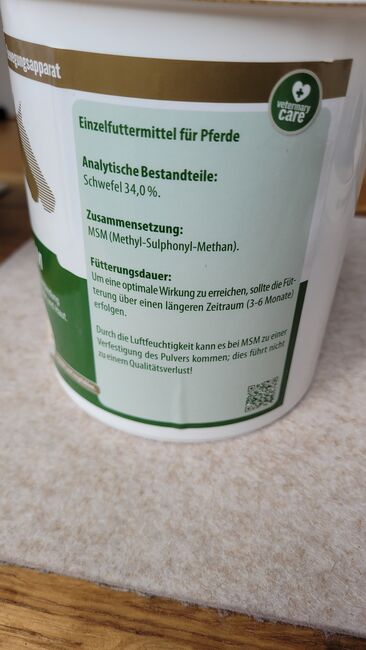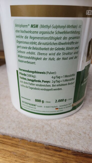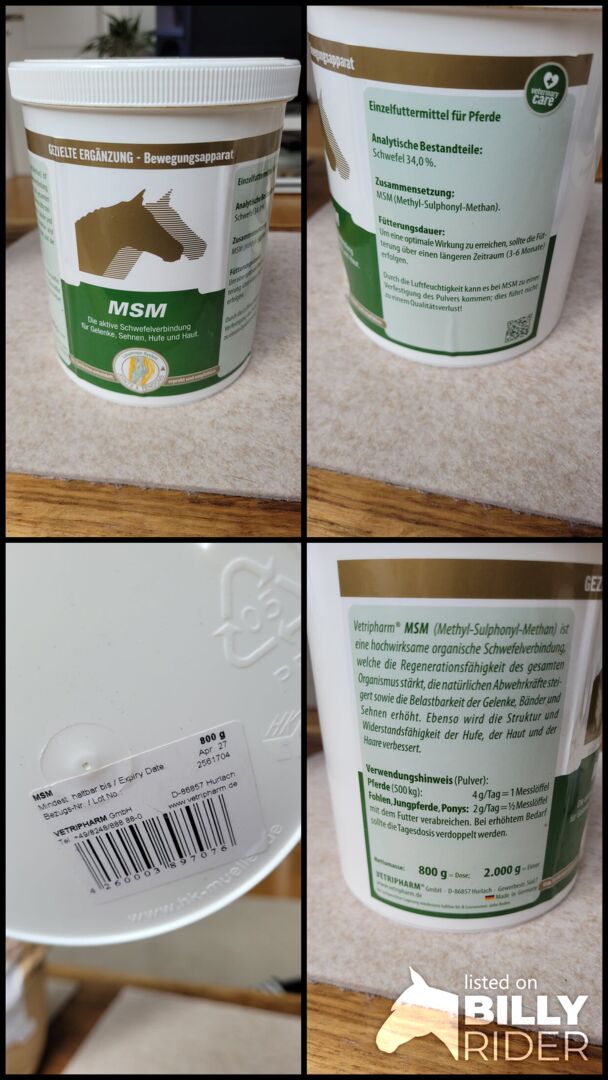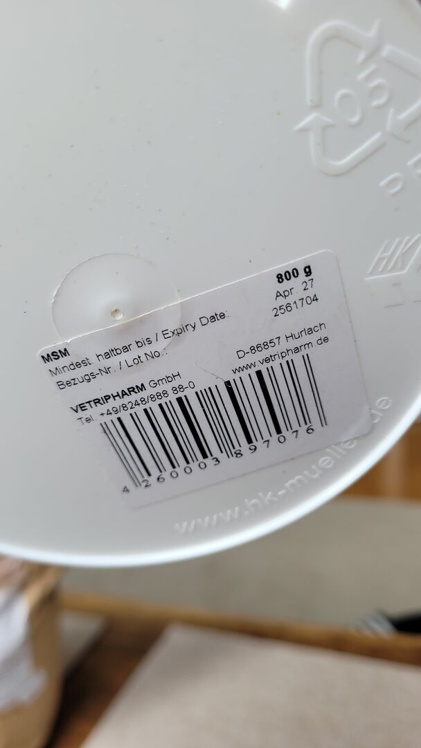 Vetripharm MSM w proszku 800 g puszka - Otwarta 800 gramowa puszka MSM w proszku z Vetripharm. Usunięto maksymalnie 5 łyżek miarowych, więc puszka jest nadal pełna. Przechowywana w chłodnym, ciemnym miejscu. Najlepiej spożyć przed kwietniem 2027 r.