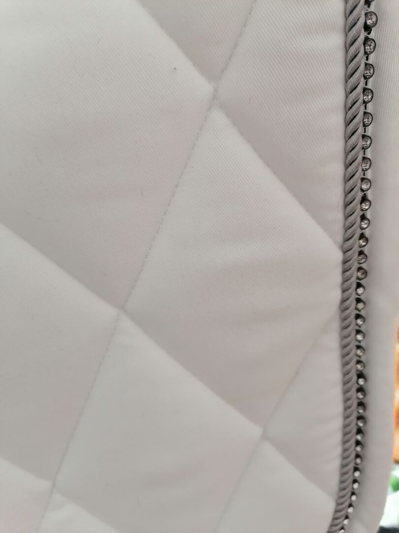 VS Competition Saddle Pad WHITE - Sprzedam nową podkładkę pod siodło turniejowe firmy Busse z lamówką z rhinestone. Na koniu była noszona bardzo krótko tylko raz bez siodła! Niestety popełniłam błąd przy zakupie i zauważyłam go za późno!