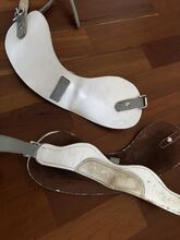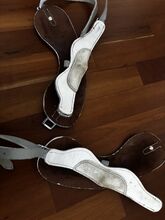 Sprzedaję parę kółek obciążających dla koni (tylko dla koni podkuwanych). Są w dobrym stanie, tylko niewielkie ślady zużycia (patrz zdjęcia). Materiał: skóra z metalowymi sprzączkami Kolor: biały / skóra naturalna Idealne do treningu lub ukierunkowanego budowania mięśni. Ważą łącznie 280 g każda!