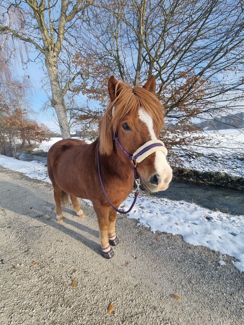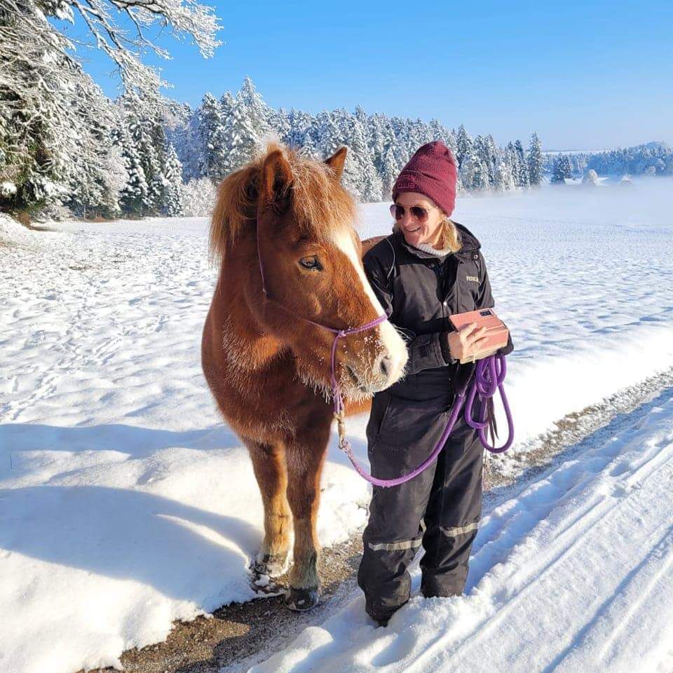Flaumur mieszka w naszej otwartej stajni w mieszanym stadzie. Ten islandzki wałach ma wysoką rangę, ale jest uczciwym szefem. W mojej grupie reprezentowane są różne rozmiary i grupy wiekowe. Flaumur ma około 1,46 metra wzrostu, urodził się w 2009 roku i biega ze mną na bosaka, a podczas jazdy konnej w butach z kopytami. Wałach był wcześniej podkuwany, co z pewnością byłoby możliwe. Flaumur reaguje na roztocza i niektóre trawy, ma łagodną egzemę, która jest dobrze kontrolowana za pomocą pudru z kwiatów siarki i derki, chociaż nosi derkę tylko na pastwisku ze mną.