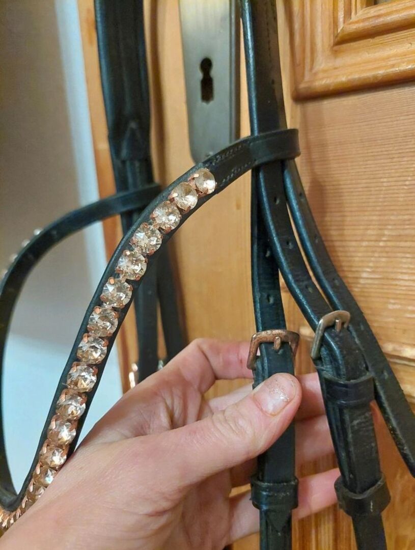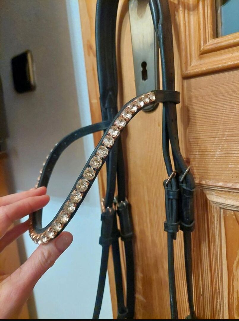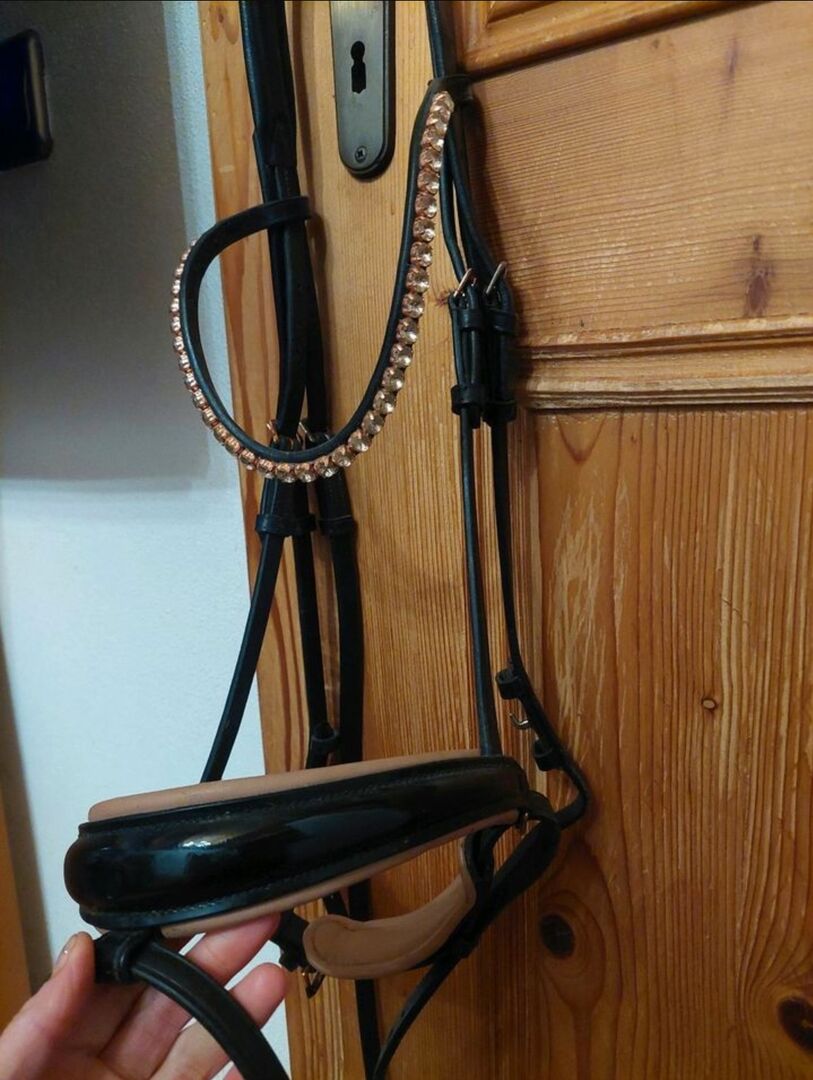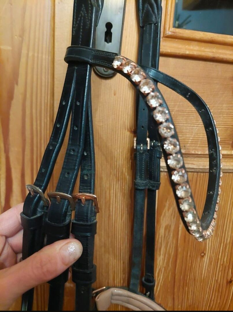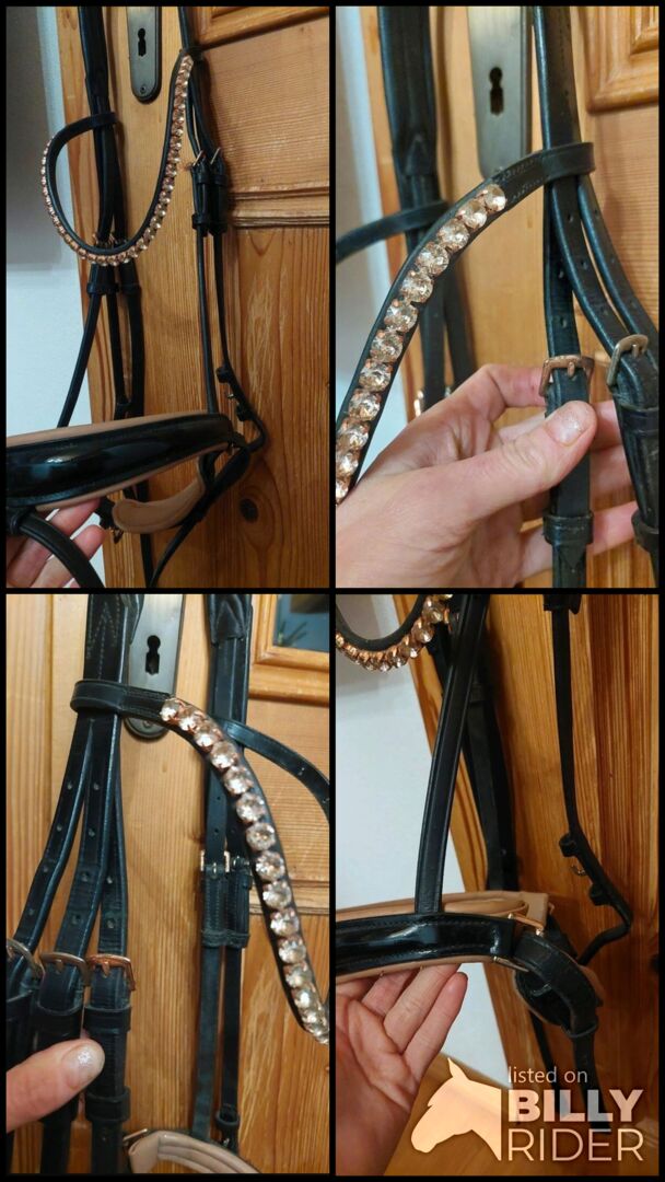Waldhausen bridle rose gold patent WB - Na sprzedaż mało używana uzda typu snaffle marki Waldhausen z okuciami w kolorze różowego złota i opaską Swarovski w kolorze różowego złota, szwedzka opaska na nos z lakierem.