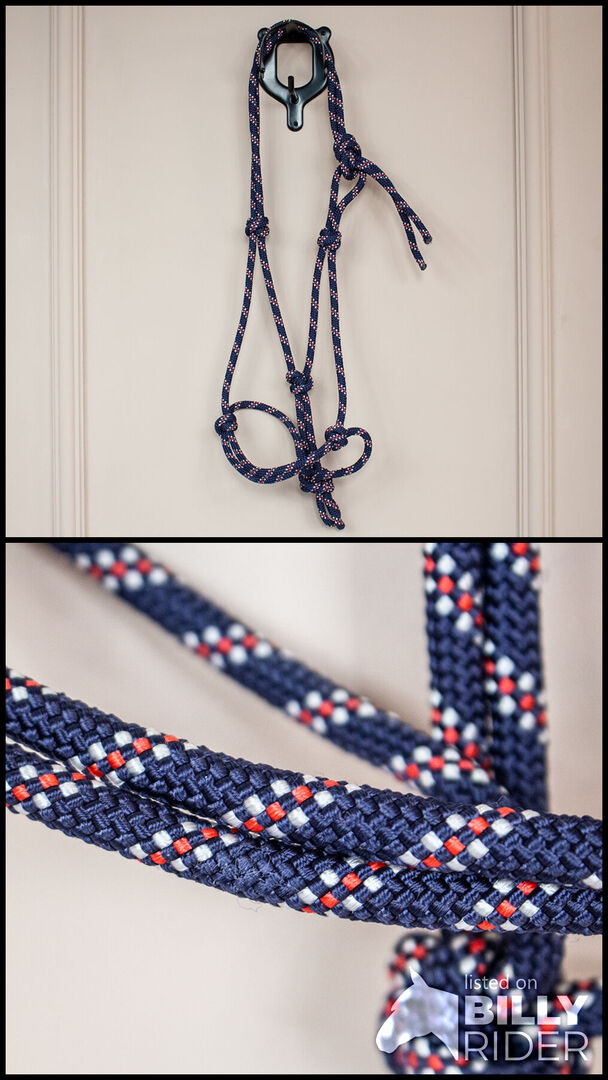Waldhausen Knotted Halter Blue/ Red Cob - Piękny halter z węzłami firmy Waldhausen w kolorze niebiesko-czerwonym jest idealny do jazdy konnej, prowadzenia i pracy na ziemi. Halter jest regulowany. Jest to rozmiar Cob/VB. Wiązana halter jest jak nowa i wykazuje niewiele śladów użytkowania. To the seller's offerlaunch