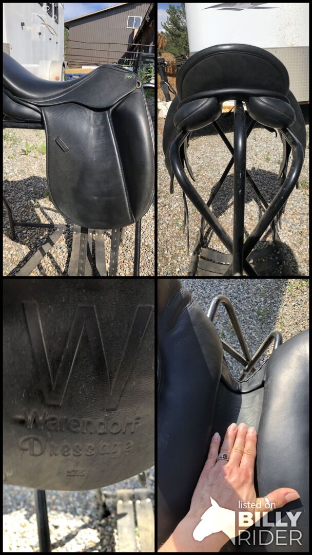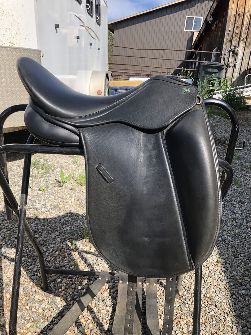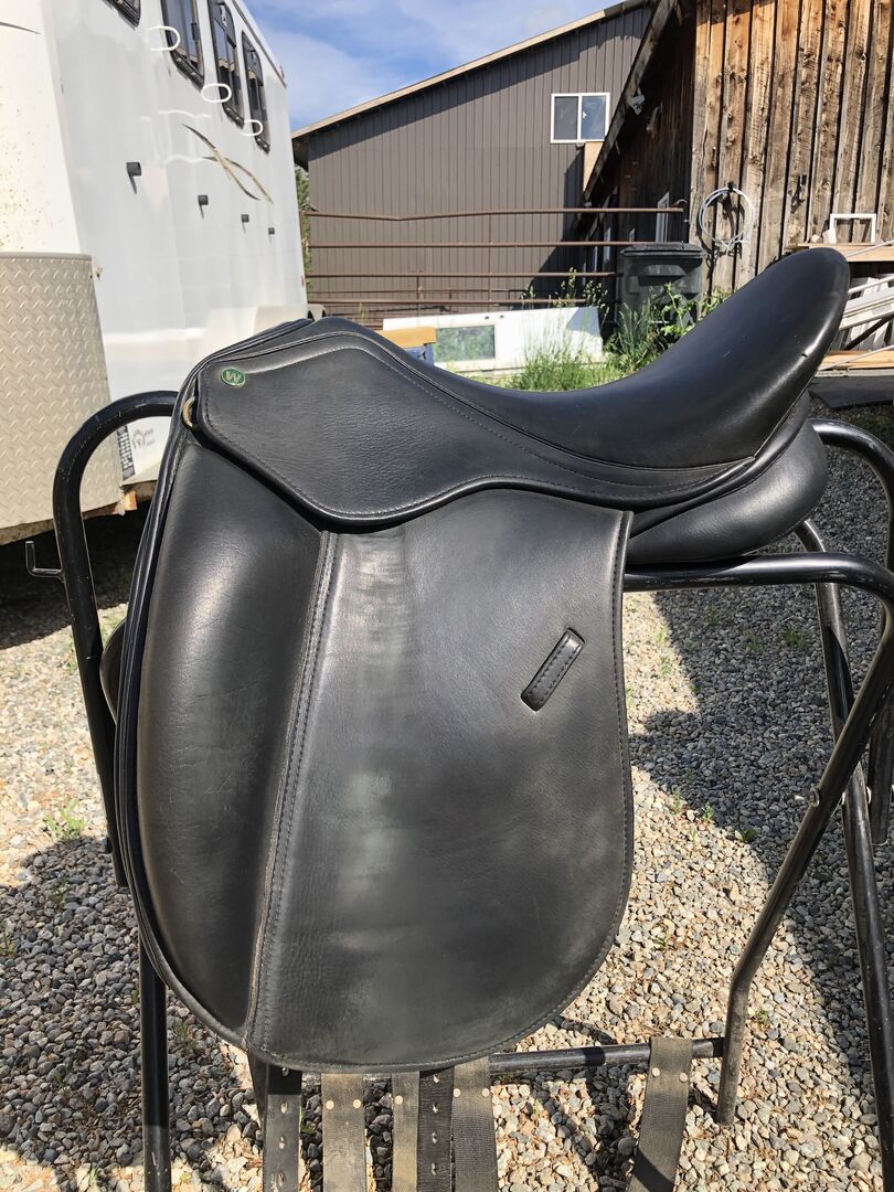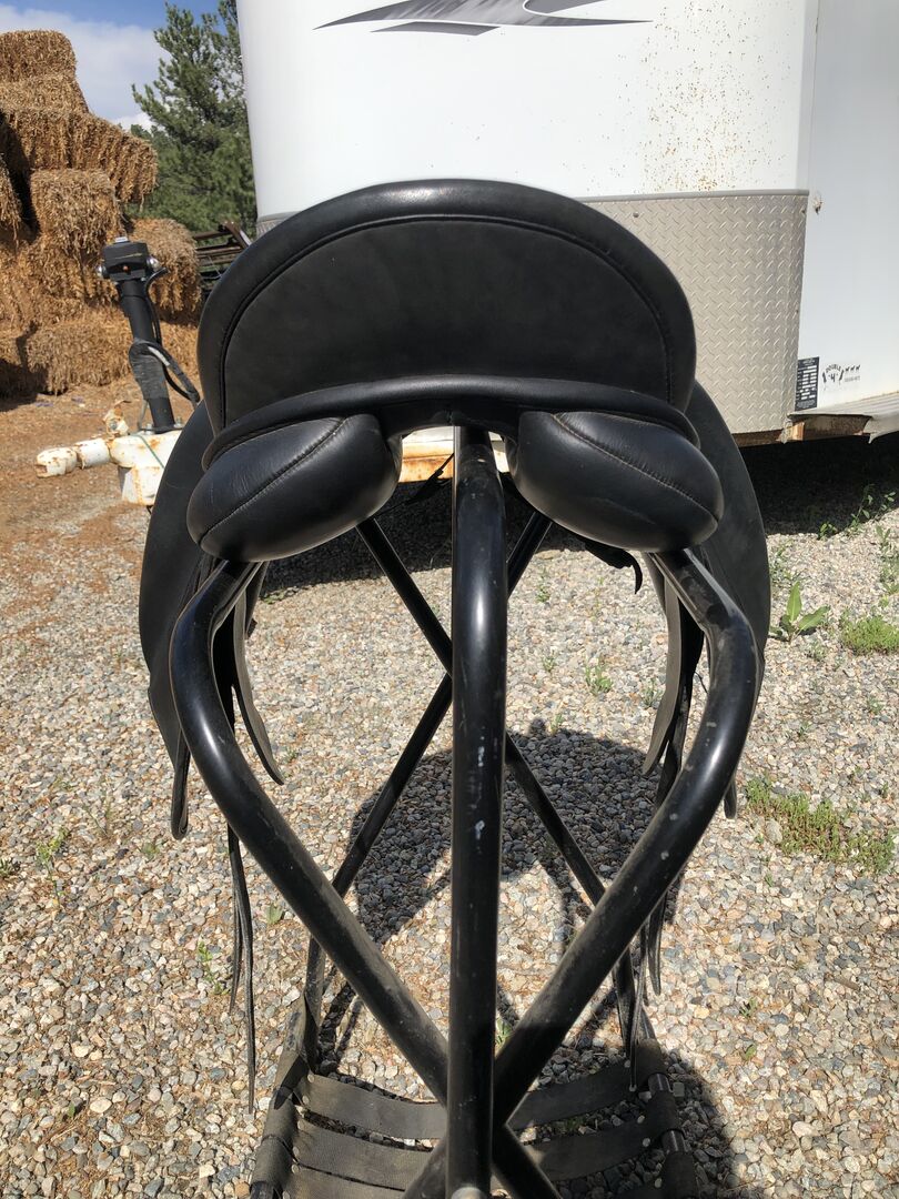 17.5” seat with a fixed med/wide gullet. Has normal wear. Tree and billets are sound. Saddle was stored under cover in a tack room. Located in Columbus, MT