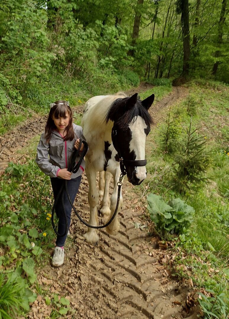 Zna źrebięce ABC i szybko się uczy - może przesłać świetne filmiki ze wszystkiego, co już zrobiliśmy. (Treningiem na smyczy, chodzeniem po tyczkach, podejściami na lonży, zajmowała się też dużo moja 8-letnia córka).