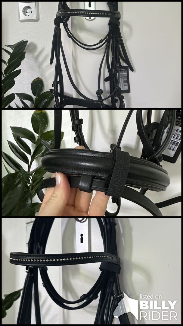 Wędzidło Montivum z lejcami, angielskie, angielskie kombinowane, czarne - Przedmiot jak pokazano na zdjęciach. Brak ukrytych wad lub czegokolwiek innego. Brakuje tylko jednego kamienia widocznego na zdjęciu. Miękka skóra i miękka wyściółka na nosku