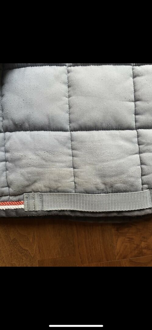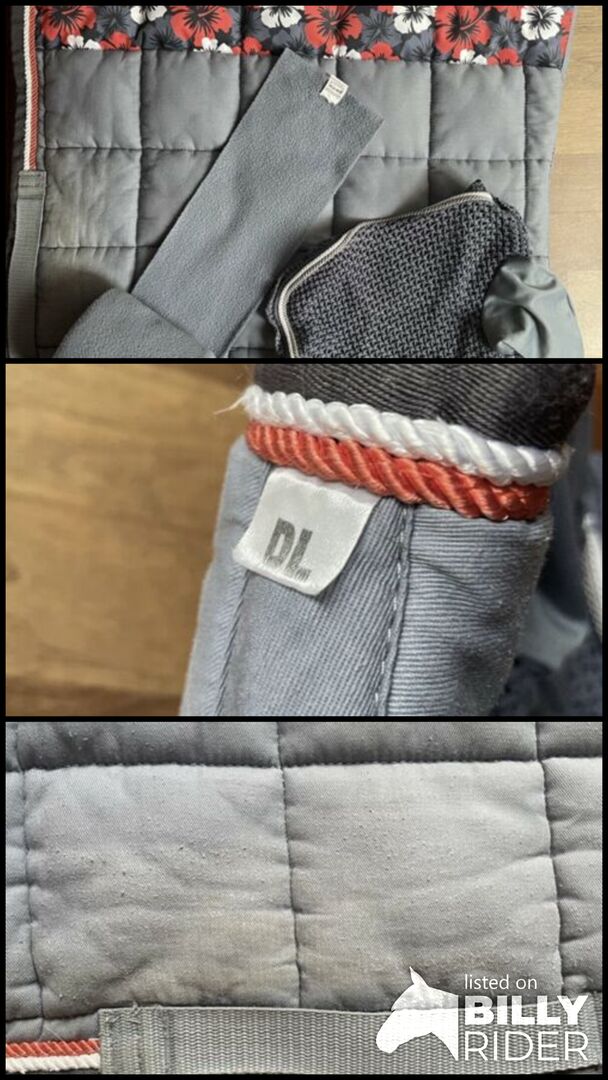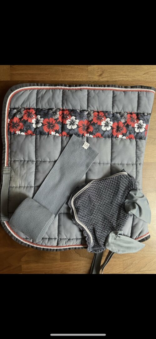 Wędzony błękit Duży kwadrat - Podkładka pod siodło w bardzo dobrym stanie z pasującymi bandażami i kapturkiem na muchy. Na pasie widoczne są jedynie normalne ślady użytkowania.