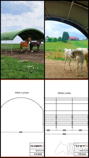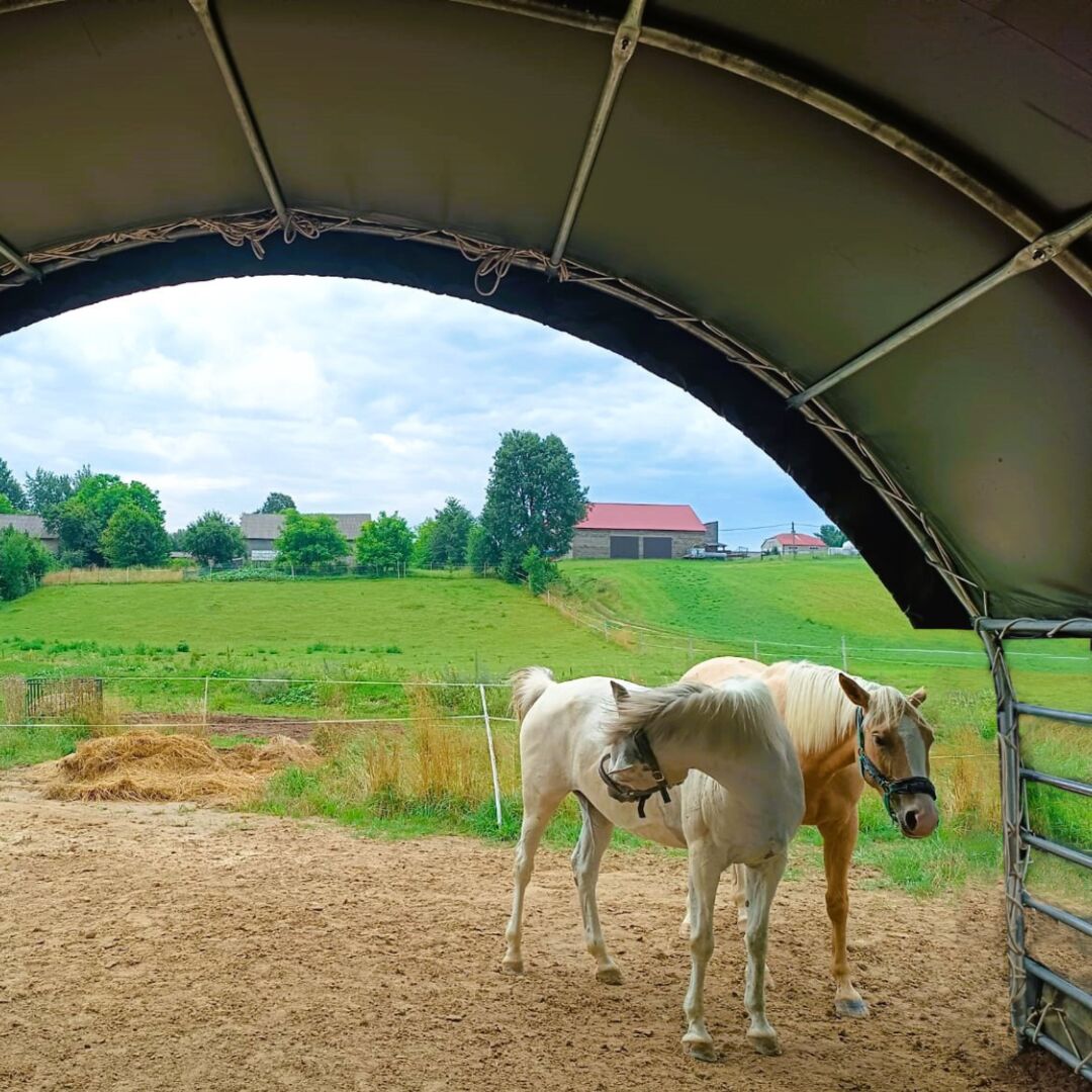 Mit einer Größe von 6x6 m, einer Höhe von 3,70 m und einer Seitenwandhöhe von 1,75 m bietet dieser Unterstand viel Platz und eine sehr praktische Nutzung im Alltag. Das Modell ist schnell montierbar, mobil und kann bei Bedarf leicht auf eine andere Weide umgesetzt werden. Die Befestigung erfolgt mit langen Metallankern, wodurch der Unterstand flexibel einsetzbar bleibt.