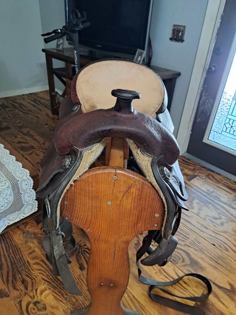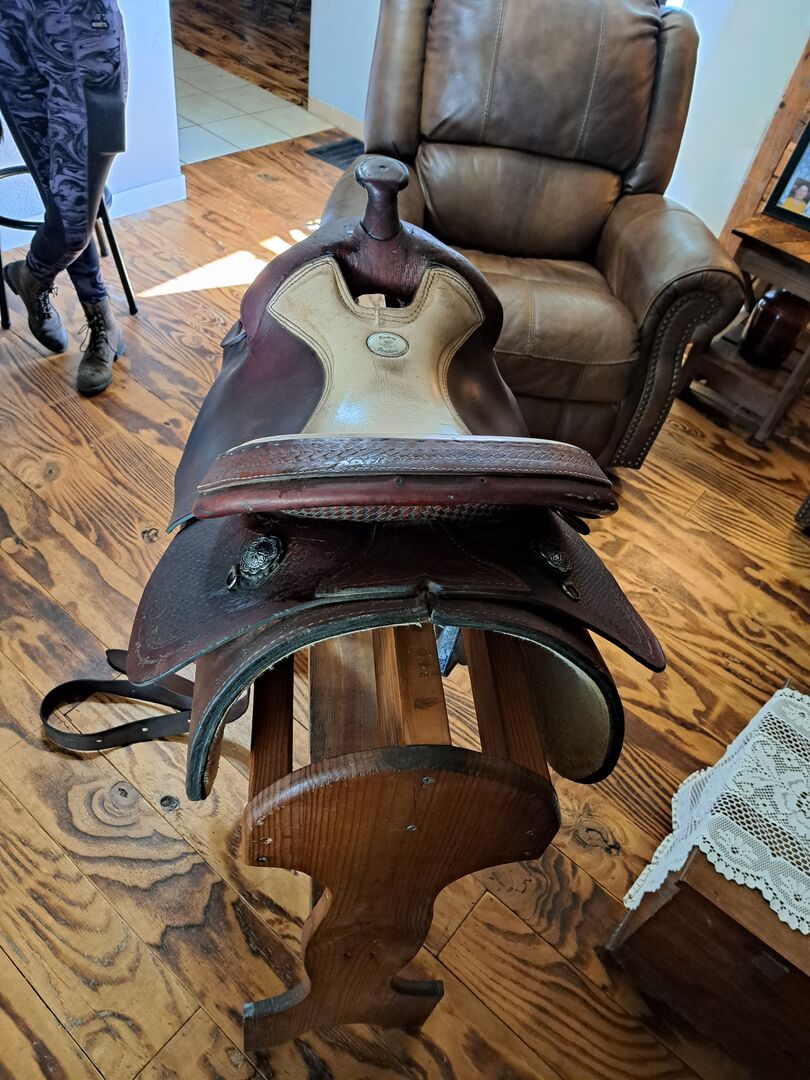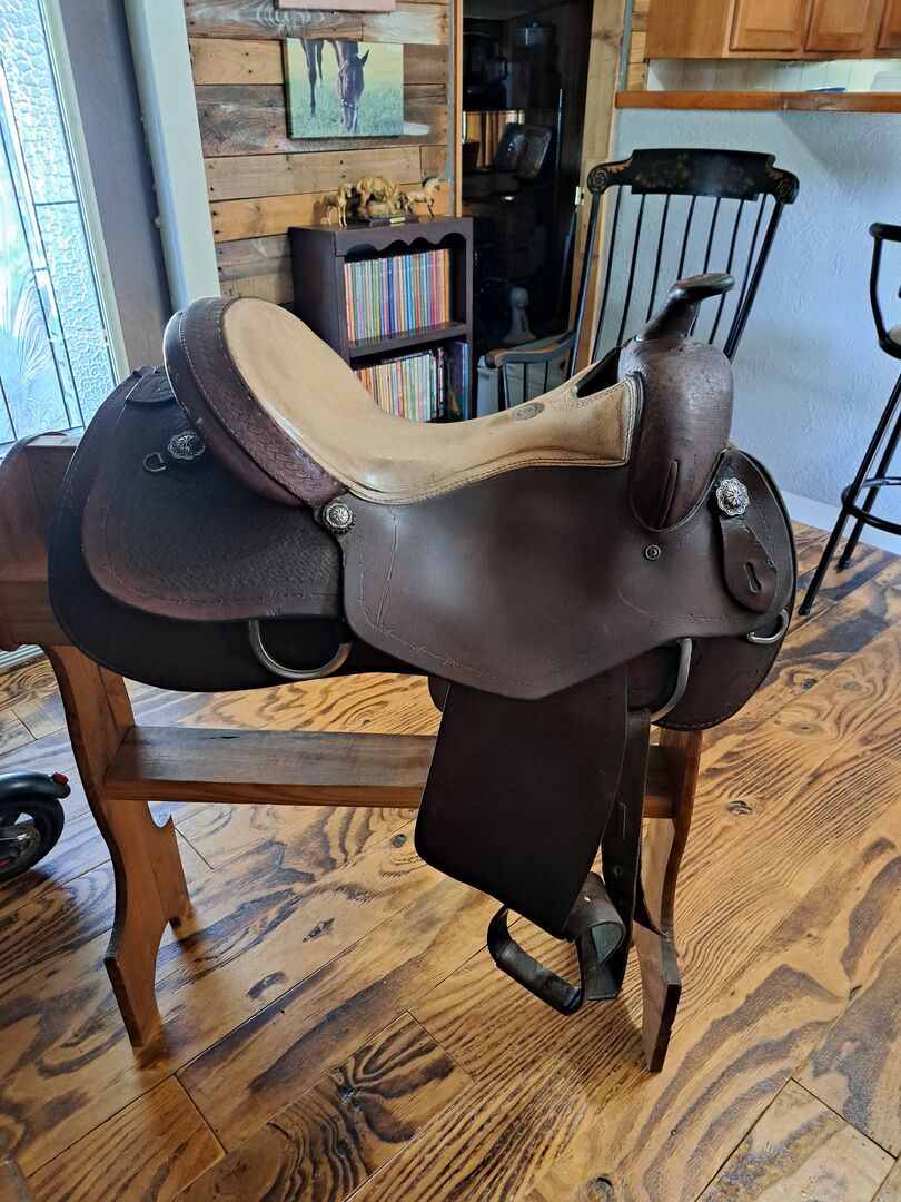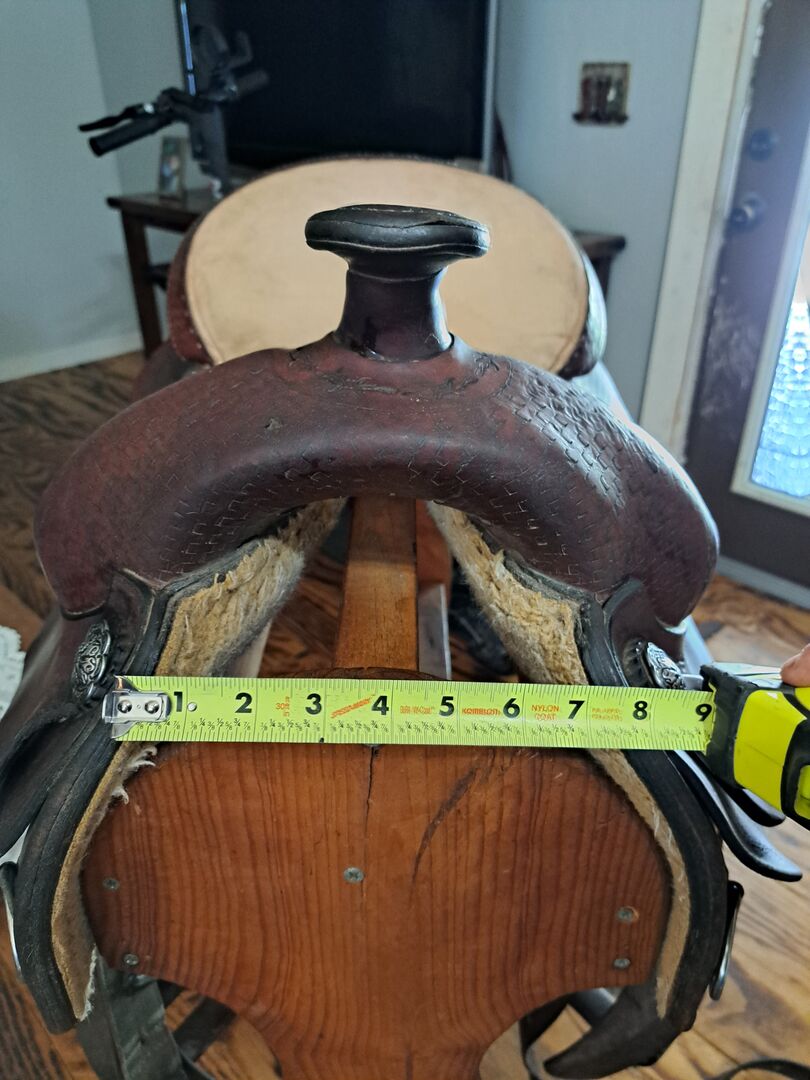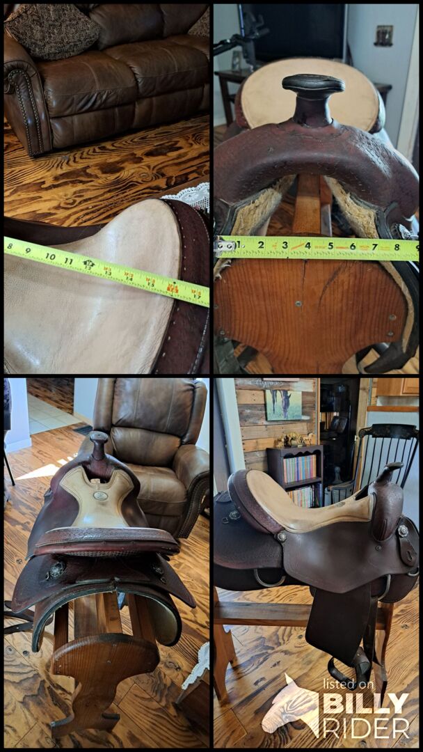 16 inch seat, Full Quarter Horse Bars Rocking R Reining Saddle. It's been cleaned and sitting in my house. Price: $1,500 includes shipping. I'm located in USA Florida