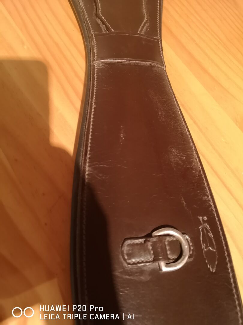 Western Saddle Girth - Oferuje pas do siodeł western. Ma 75 cm długości i 13 cm szerokości. Najwęższa część ma szerokość 8,5 cm. Na środku pasa znajduje się pierścień służący do mocowania napierśnika. Klamry mają po 9 cm szerokości, a kolec ma 7,5 cm długości. Pas jest wykonany ze skóry. Jest on świeżo wyczyszczony i nasmarowany (z zastosowaniem środków do pielęgnacji skóry). Ponieważ jest to produkt używany, widać na nim ślady użytkowania, głównie w miejscach, gdzie znajdują się sprzączki. Ale tak naprawdę są to tylko wady.