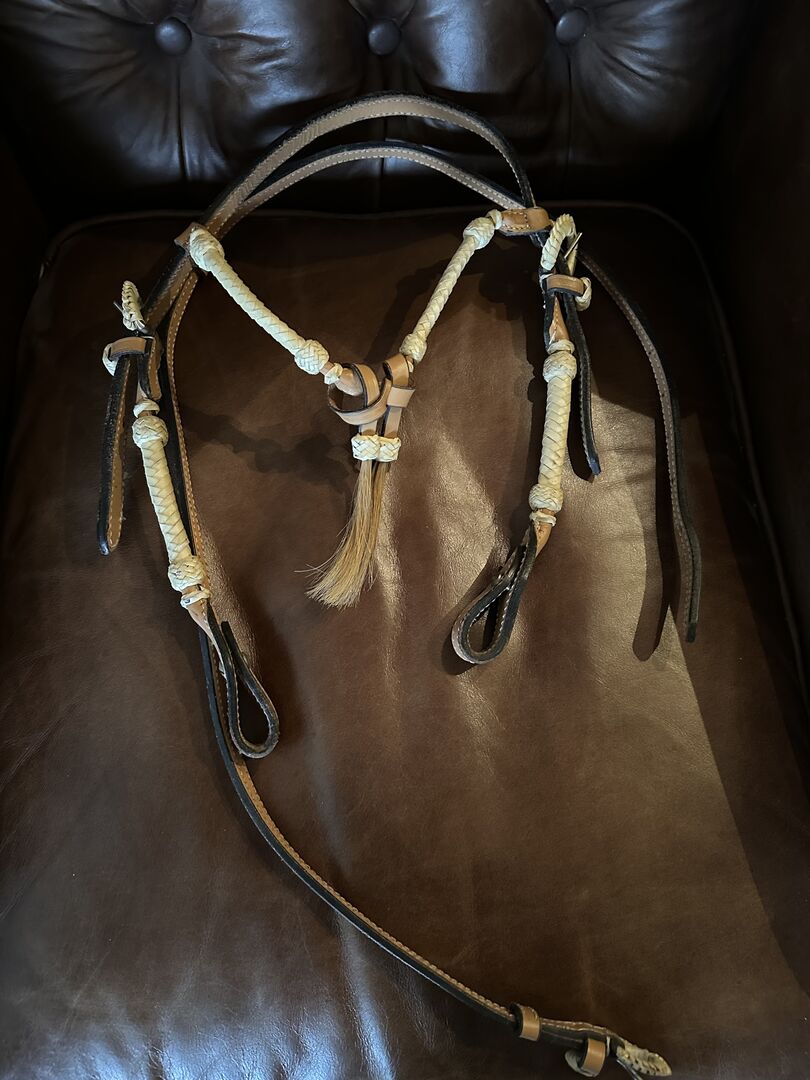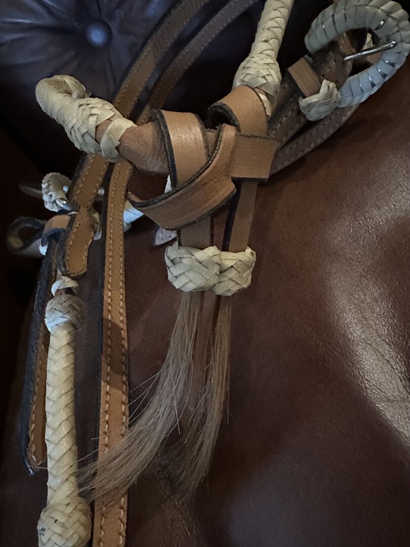 Western snaffle headpiece nowy skórzany rozmiar VB - Jak nowy, nigdy nie używany westernowy nachrapnik / naczółek wykonany z prawdziwej skóry ozdobiony prawdziwym włosiem i surową skórą. Rozmiar VB.