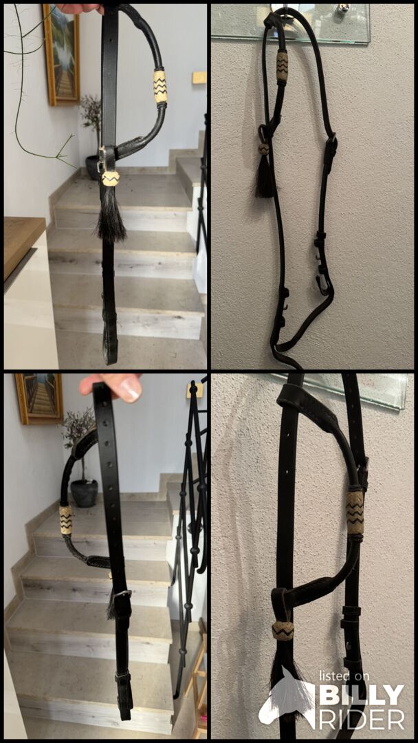 Western snaffle z pojedynczym uchem - Piękny, czarny nachrapnik western z pojedynczym uchem. Ozdobiony surową skórą w kolorze beżowym. Nie był używany. Rozmiar VB. Plus wysyłka