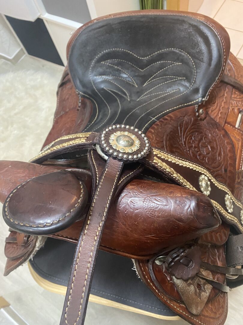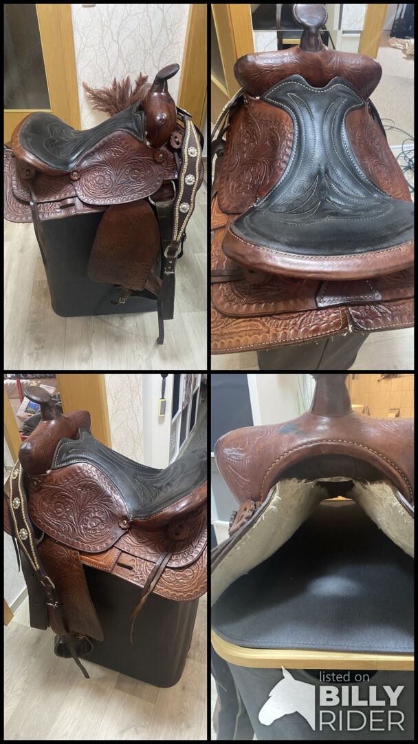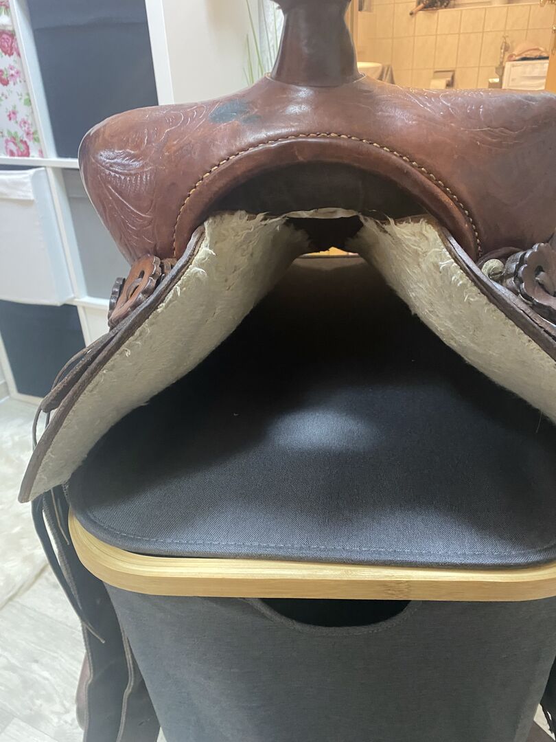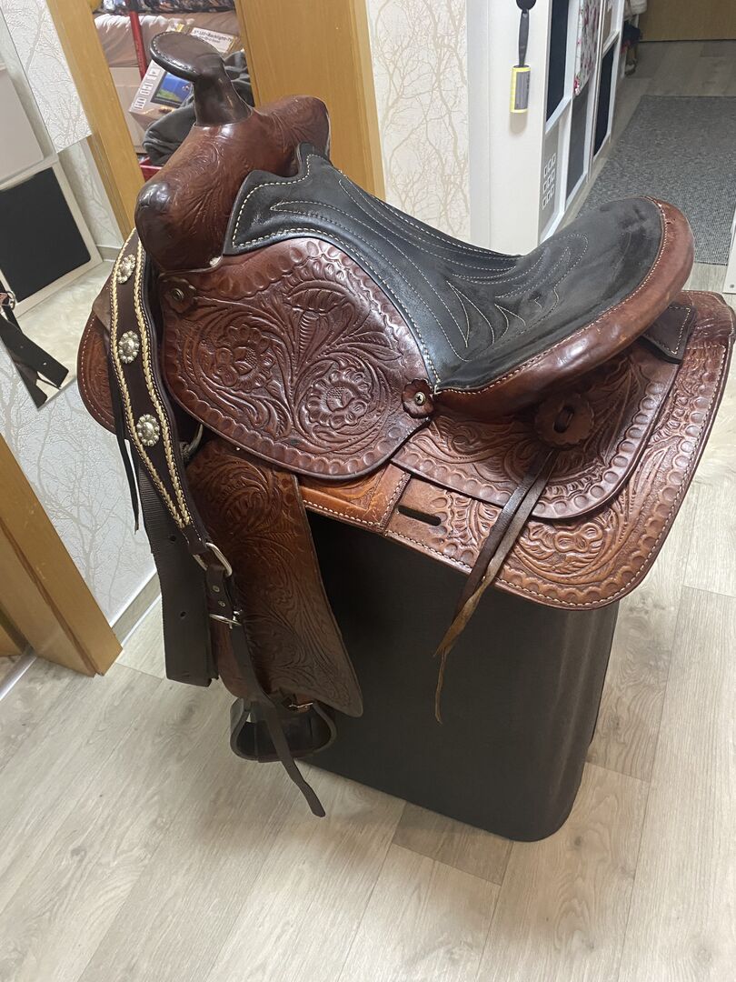Westernowe siodło w super dobrym stanie !!! - Oferuję bardzo rzadko lub nigdy nie używane siodło westernowe z pasującą uzdą, popręgiem i napierśnikiem.