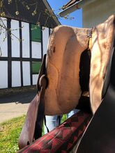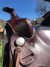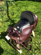 Westernowe siodło wyprodukowane w USA - Używane siodło western z podkładką, popręgiem neoprenowym i pokrowcem z jagnięcej skóry (zimowym), dwukolorowe, wymiary patrz zdjęcia. Siodło ma około 63 cm długości