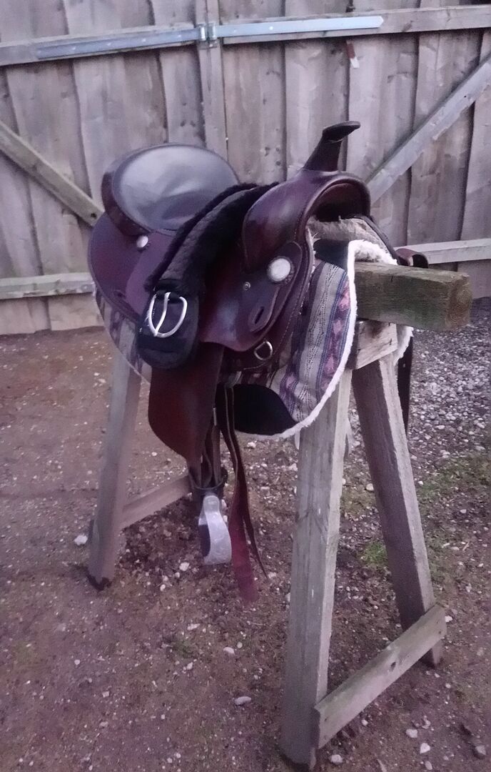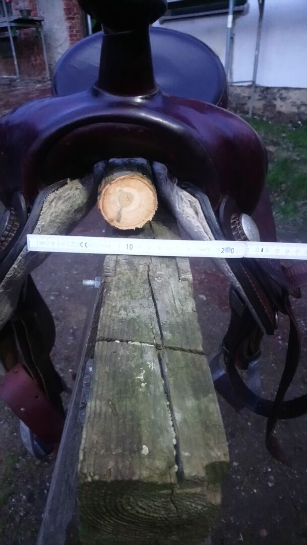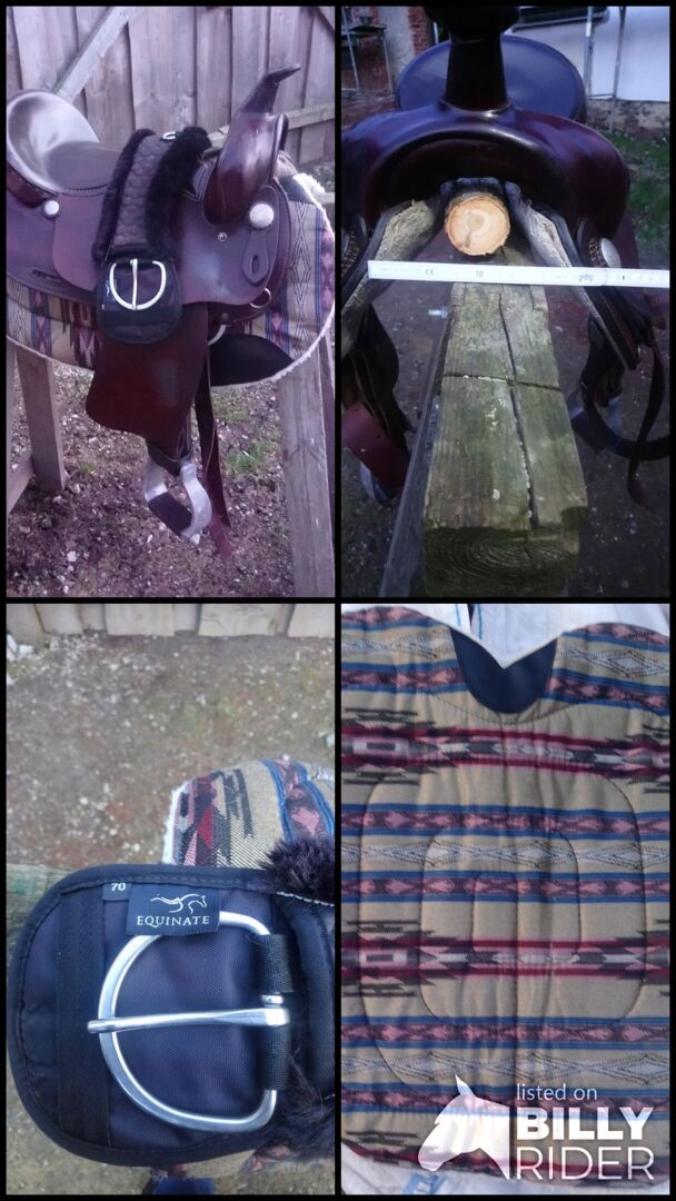 Westernowe siodło z popręgiem i podkładką - Sprzedam moje używane, ale dobrze utrzymane siodło westernowe wraz z podkładką i popręgiem (70 cm). Jest to siodło Texas Best, model 1346 - zobacz wymiary na zdjęciach. Siodło zawsze było przechowywane w suchym miejscu i regularnie konserwowane, ale wykazuje kilka oznak zużycia (skóra rozdarta na strzemieniu - patrz zdjęcia). Waga wynosi około 12 kg. W razie jakichkolwiek pytań prosimy o kontakt.