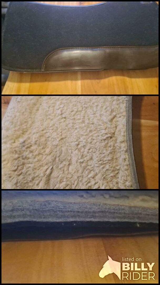 Anatomicznie ukształtowana zachodnia podkładka typu sandwich. Amortyzacja wstrząsów i oddychalność. 78 x 80 cm. Grubość 3,5 cm. Wierzchnia strona - 100 % wełny merynosów, środkowa część - 100 % filcu poliestrowego, spód - 100 % tkanego futra poliestrowego.