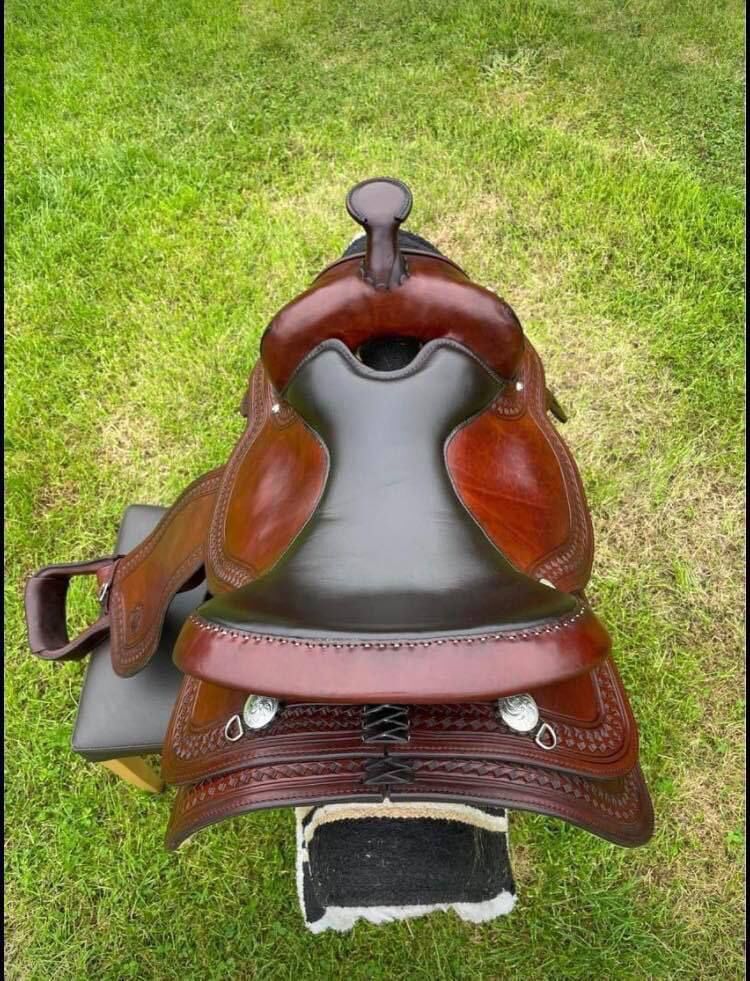 Wunderschöner, hochwertiger Westernsattel in ausgezeichnetem Zustand. Der Sattel besteht aus braunem Leder mit detaillierter Punzierarbeit und vereint Langlebigkeit mit klassischem Stil. Er wurde stets gut gepflegt und ist sofort einsatzbereit.