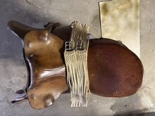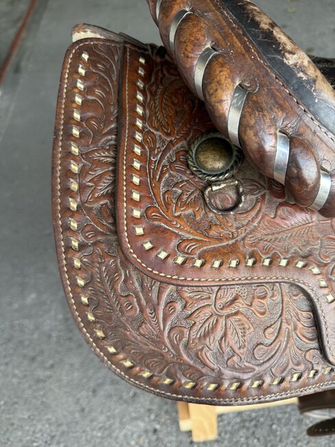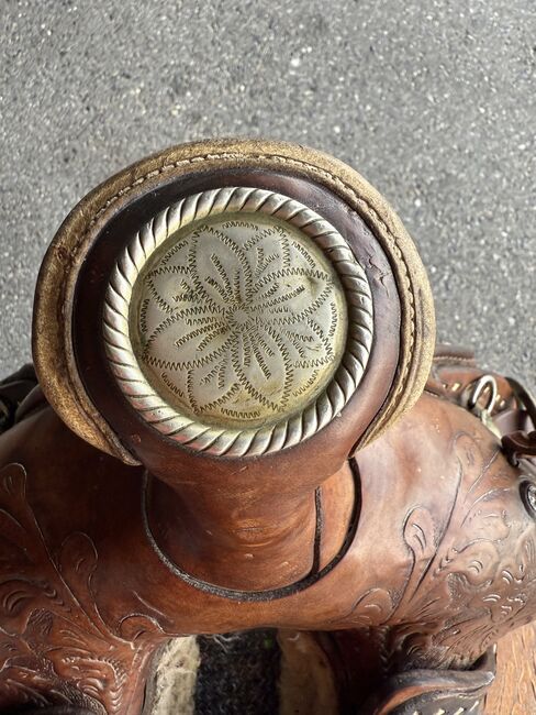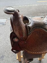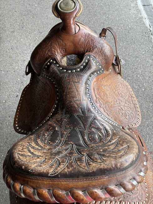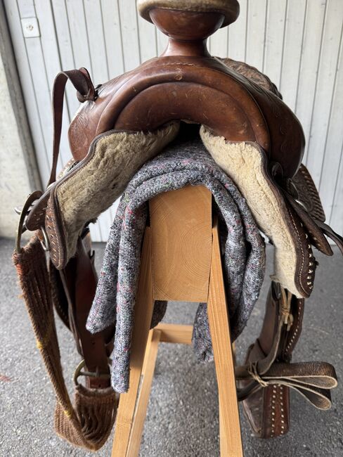 Gepflegter Westernsattel; gekauft in den USA vor gut 10 Jahren. Gekauft haben wir ihn grundsätzlich um mit ihm auszureiten, die Pläne für einen Pferdekauf haben sich aber zerschlagen. Somit haben wir ihn im Haus als Schmuckstück gehegt und gepflegt. Abgegeben werden kann zudem auch noch ein aus unserer Sicht immer noch brauchbarer Sattel in der Grösse 17.5 Zoll (44cm) der Marke J.A. Barnsby % Sons.