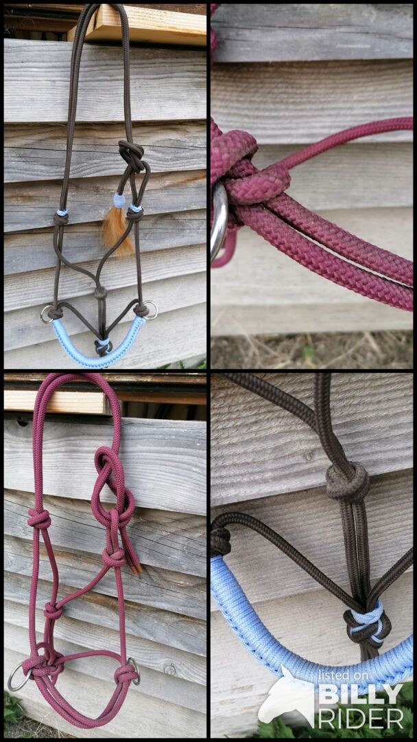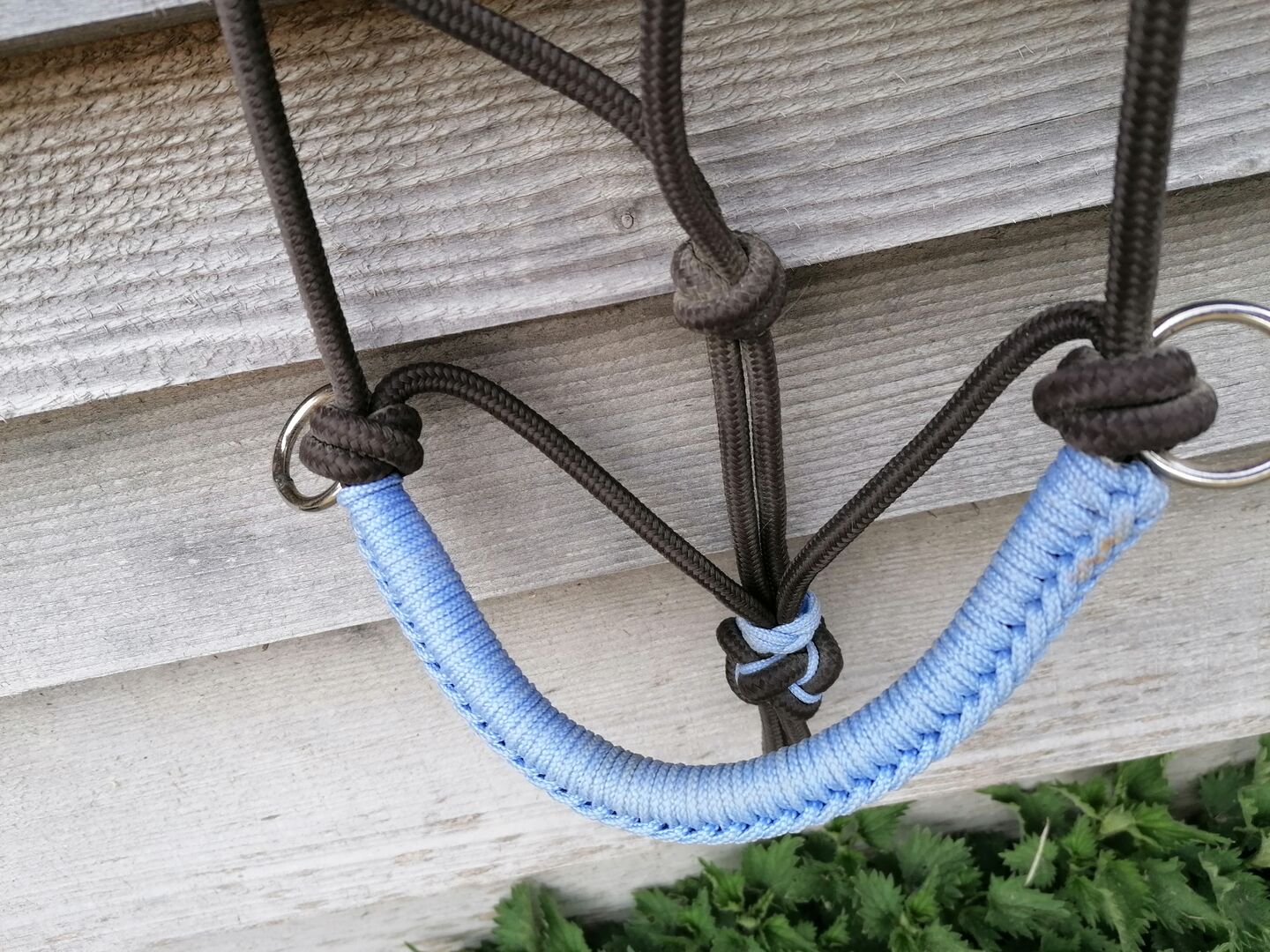 Wiązana opaska na nos - 2 wiązane kantary, brązowo-niebieski dla kucyka i czerwony dla kolby.