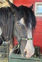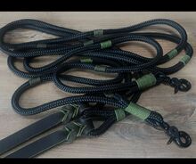 Wiązany halter "Black Pepper" - Bardzo elegancki kantar w kolorze czarnym, w połączeniu z czarnym/zielonym pieprzem/oliwką z pierścieniami do wodzy - odpowiedni do jazdy konnej. Wykonany ręcznie przez Colorful Pearl z dopasowanymi wędzidłami westernowymi (otwartymi), długość 2,20 m z czarnej liny o grubości 10 mm z kolorowymi akcentami i skórzanymi naszywkami. Nowa cena kantara - 95,00 € Nowa cena wodzy - 62,00 € Cena ofertowa razem - 90,00 € Można również kupić pojedynczo.