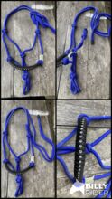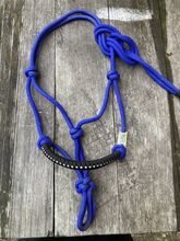 Wiązany halter z błyszczącymi kamieniami - Wiązany halter w dwóch kolorach z błyszczącymi kamieniami na nosku. Stan bardzo dobry, użyty 3 razy, regulowane węzły. Rozmiar: Pony/ Shetty. Cena: 10,- Odbiór w 77880 Sasbach. Możliwa wysyłka, opłata pocztowa płacona przez kupującego.