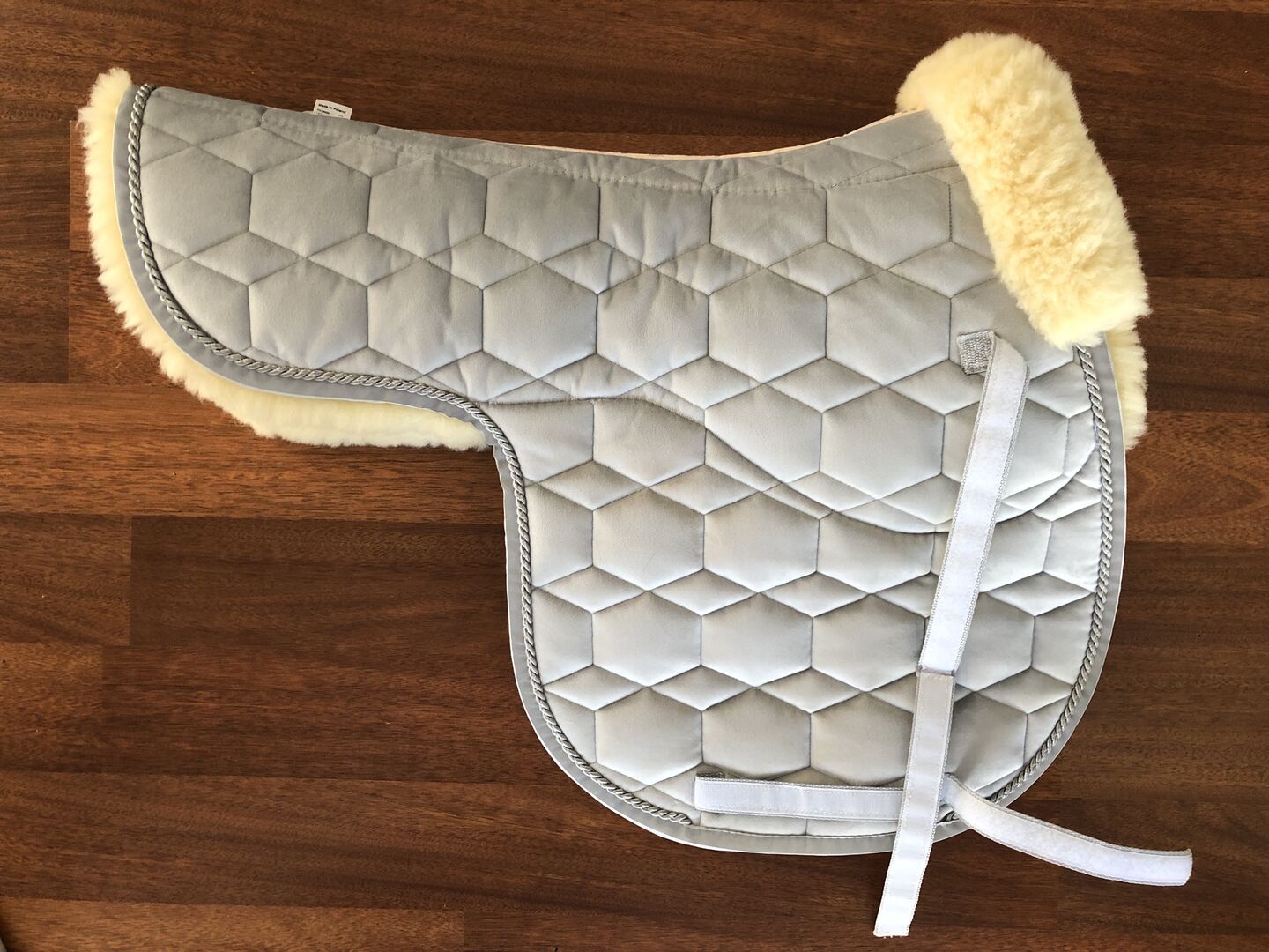 wNEW L VS Mattes lambskin saddle cloth Reflex saddle pad Reflex L VS - Pokrowiec na siodło jak nowy, był tylko raz na koniu i okazał się dla nas za duży (wyprany raz z detergentem Mattes Melp). Górny materiał aksamitny (srebrny) Srebrna lamówka z materiału Refkex. Idealna na jesienne/zimowe przejażdżki