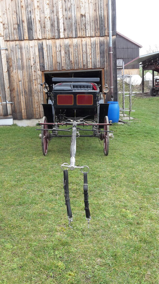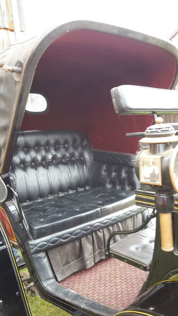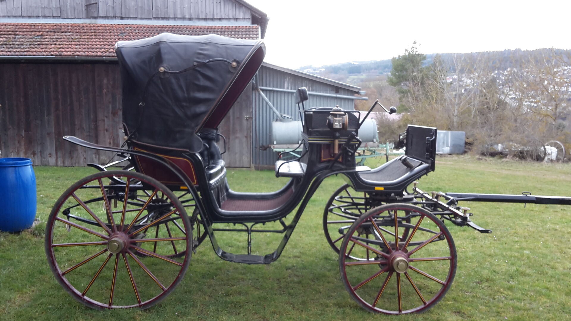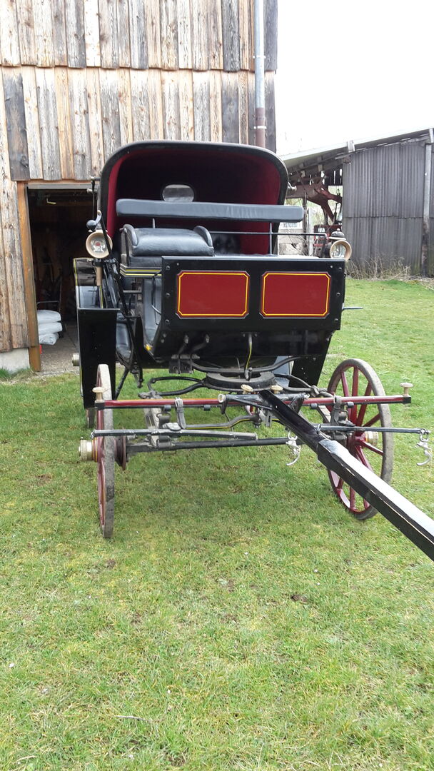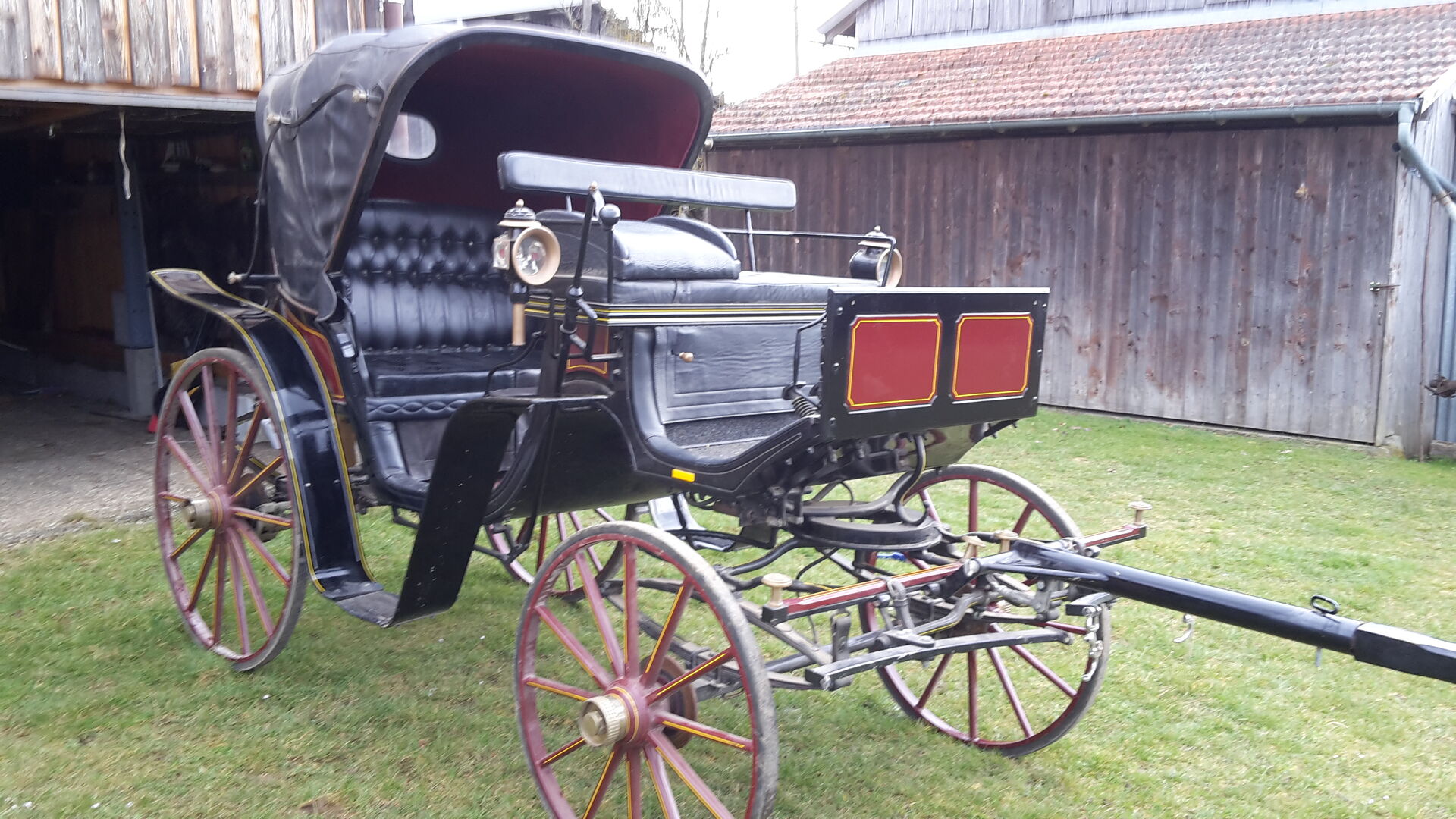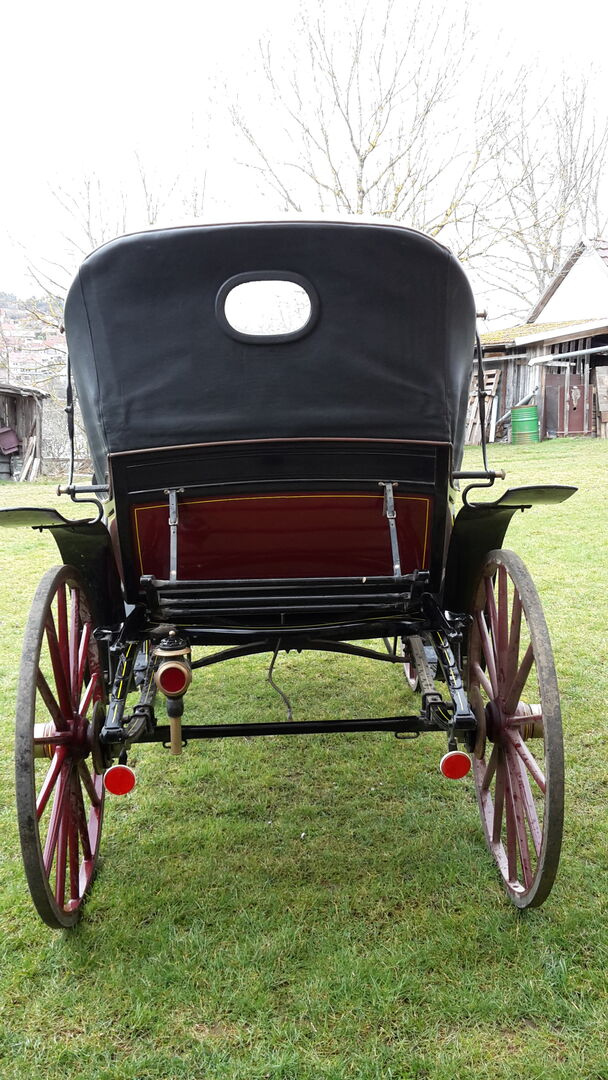 Wózek Victoria - Używany wózek z półpokładem. 4 miejsca siedzące i 2 miejsca dla kierowcy. Siedzenie pokryte czerwonym aksamitem. Hydrauliczne hamulce tarczowe z przodu i z tyłu. Masa własna 625 kg. Wymiary dł./szer./wys.: 3200/ 1640/ 2200 Mi dyszel 6050. Koła drewniane szprychowe gumowe przód 900 tył 1220.