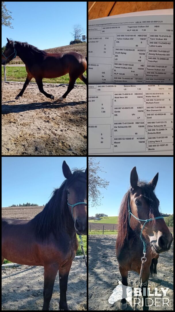 Obecnie jest w trakcie aklimatyzacji do wagi jeźdźca. Bardzo grzeczna klacz, która bardzo szybko się uczy i pokazuje się z jak najlepszej strony. Ma również bardzo dobry rodowód. (patrz ostatnie zdjęcie) Więc widzę tę klacz jako całkowicie wszechstronną. Rekreacja, powożenie, hodowla i sport.