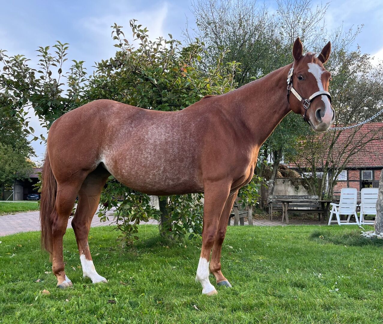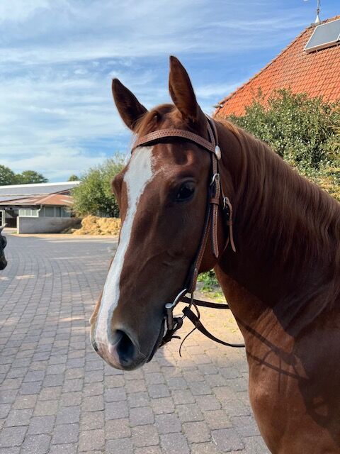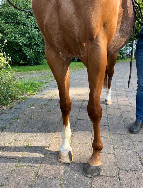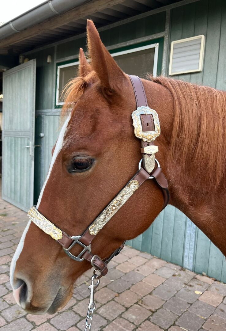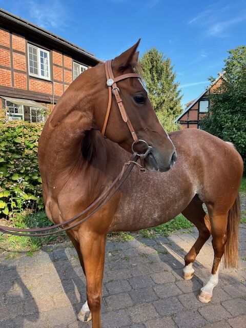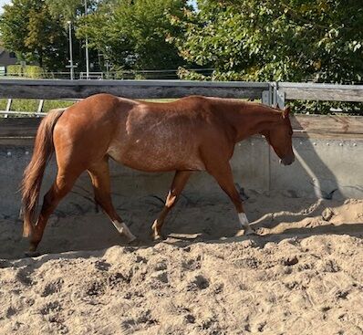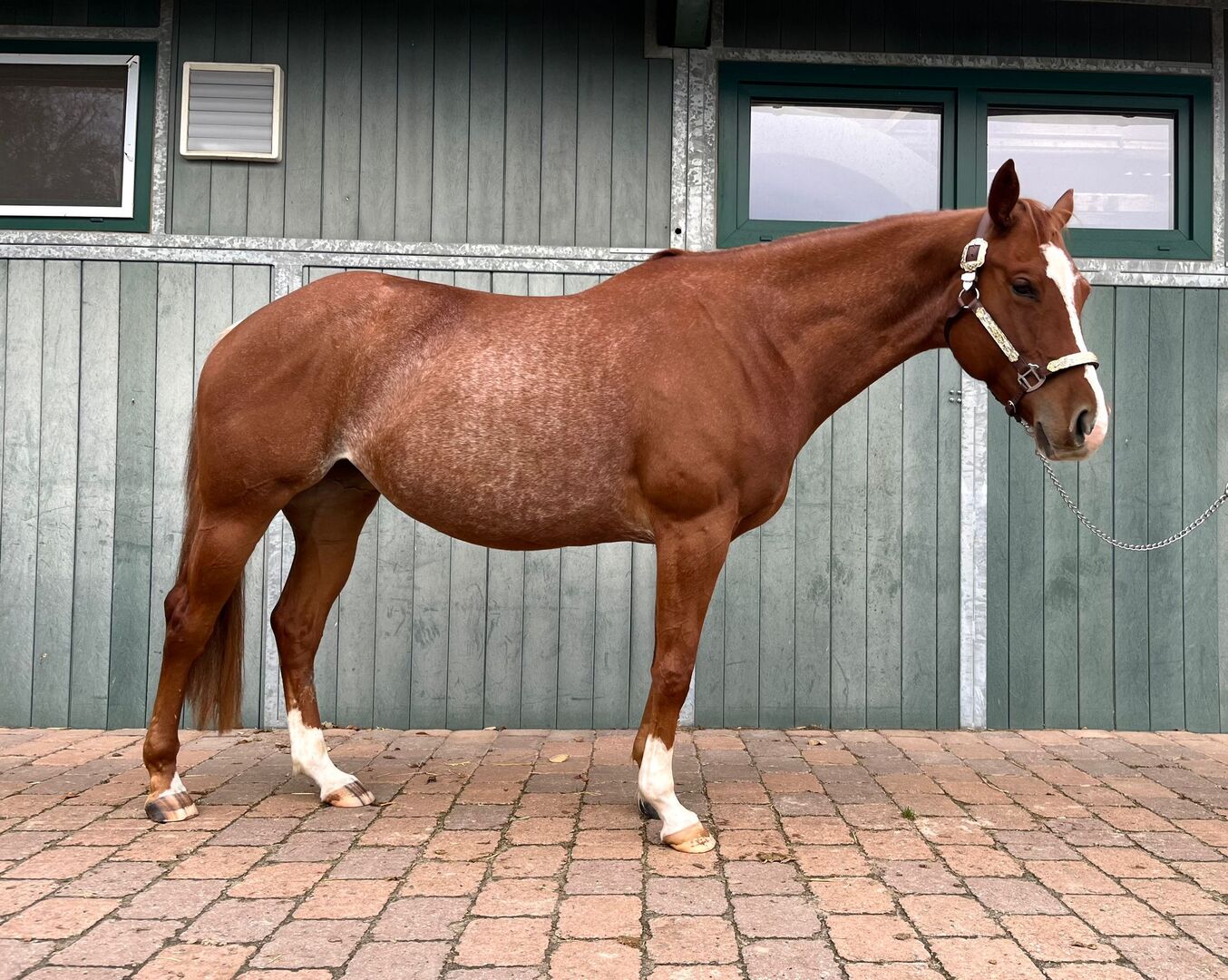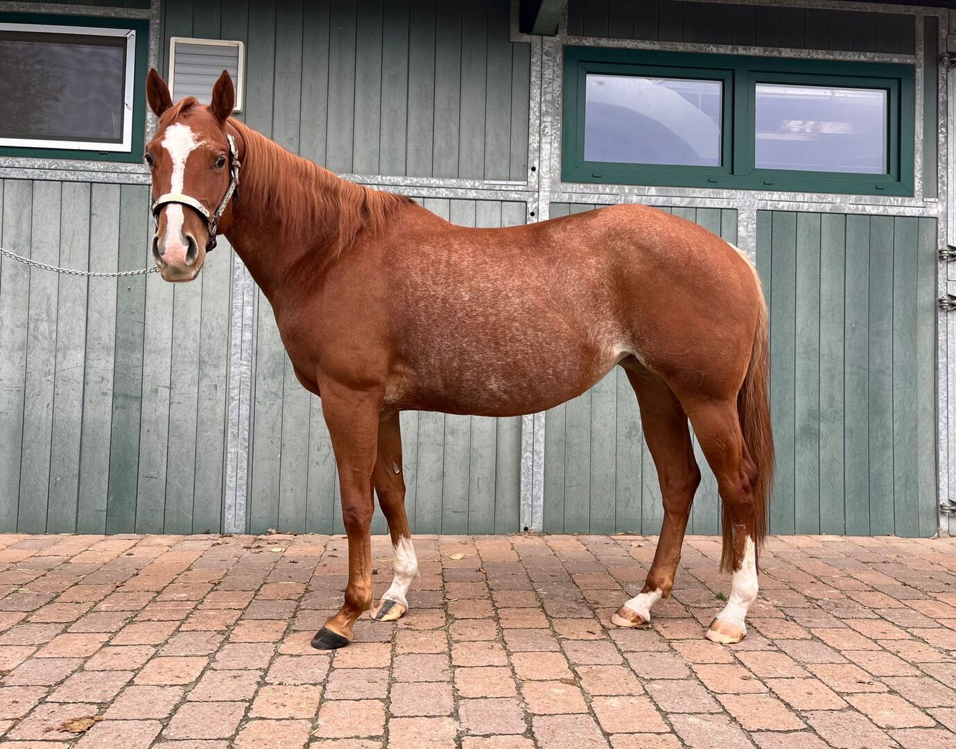 Smooth N Silent Cleo - ta piękna klacz rasy Quarter Horse urodzona w 2020 roku o wzroście 150 cm przekonuje swoim absolutnie uroczym charakterem, ludzką naturą i wspaniałym umaszczeniem szczawiu z cętkowaną sierścią. Jest raczej drobna i dobrze wyważona. Nie będzie nosicielem wagi. Cleo ma lekkie wewnętrzne ustawienie przednich nóg, ale to w ogóle jej nie ogranicza. Dostępny jest niedawny test zginania bez wyników. Poza tym jest zdrowa. Cleo jest zaznajomiona z boksami padokowymi, otwartą stajnią i całodobowym wypasem. Charakter klaczy to marzenie. Jest bardzo słodka i zawsze stara się zadowolić swojego jeźdźca. Dobrze zachowuje się pod siodłem. Niemniej jednak nie jest jeszcze koniem dla początkujących ze względu na poziom wyszkolenia i wiek. W niektórych sytuacjach nadal potrzebuje asekuracji jeźdźca. Cleo jest pewna siebie w podstawowych chodach. Wie, jak pracować na arenie, w hali i w round penie. Jest świetnym koniem do rekreacji i nie tylko. Ma bardzo dobry rodowód do wszechstronnej jazdy. Nadawałaby się do przyjemności, jeździectwa, trailu i showmaństwa. Z bardzo ciężkim sercem zostanie sprzedana tylko w absolutnie dobre ręce, bez sprzedaży w trudnej sytuacji. Nie będzie sprzedawana dealerom ani szkółkom jeździeckim. Można również kupić akcesoria, takie jak siodło, podkładka i uzda.