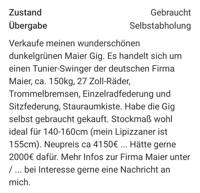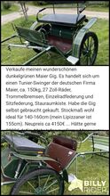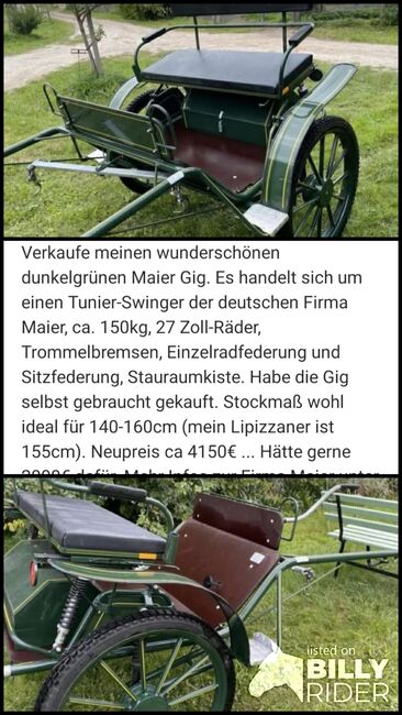 Wspaniały koncert od firmy Maier - Sprzedaję mój piękny ciemnozielony koncert. Jest to turniejowy swinger renomowanej niemieckiej marki Maier. Gig jest lekki, ma doskonałe zawieszenie i oferuje komfort, jakiego można sobie życzyć dzięki dużym kołom, niezależnemu zawieszeniu i regulowanemu siedzeniu. Waga około 150 kg, 27-calowe opony pneumatyczne, hamulce bębnowe, niezależne zawieszenie i zawieszenie siedzenia oraz schowek. Sam kupiłem ten wózek z drugiej ręki. Powiedziałbym, że idealny wzrost konia to 140-160cm. Nowa cena około 4150€. Więcej informacji o firmie Maier można znaleźć pod Maier Sulky. Lokalizacja w pobliżu Halbturn / Burgenland. Transport za benzynę byłby możliwy.