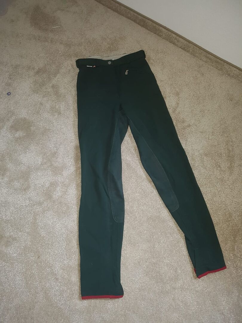 Wygodne bryczesy jeździeckie - Ciemnozielone bryczesy z pełnym siedzeniem w tym samym kolorze. Mankiety nogawek z rzepami nieliczne ślady użytkowania, rzadko noszone
