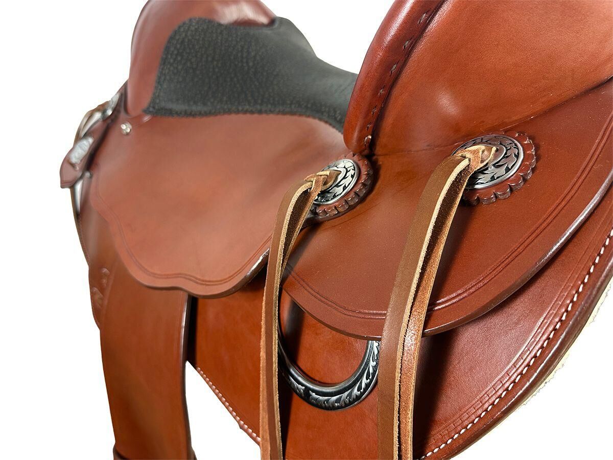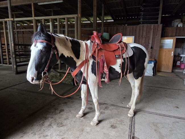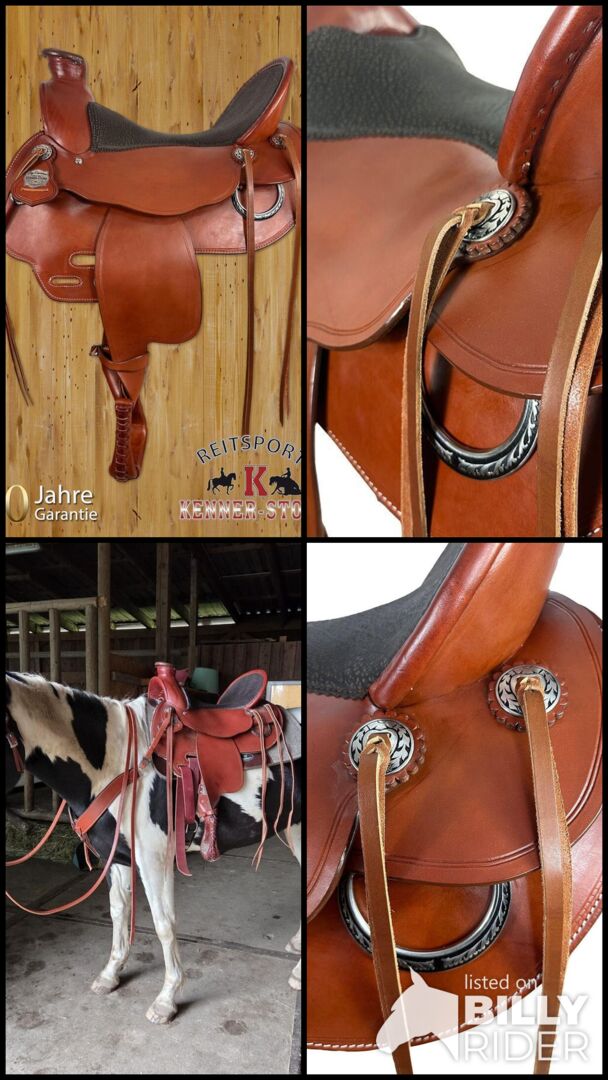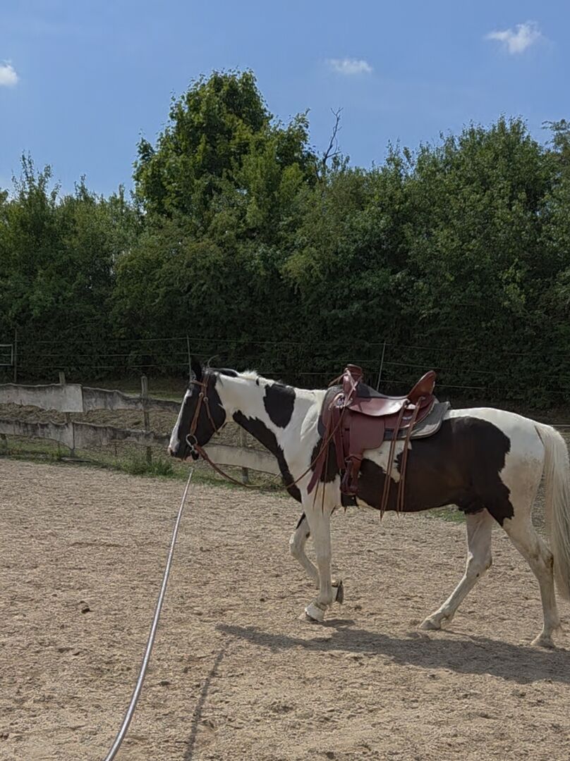 Wyjątkowe, bardzo wygodne siodło westernowe - Oferuję moje dopasowane siodło westernowe Equiflex z dopasowaną uzdą i napierśnikiem, które zrobiłem dla mojego młodego chłopca pinto. Ma 150 cm i jest dość drobny, nie ma huśtawki. Niestety, mój młody koń został zdiagnozowany jako niezdolny do jazdy. Mam więc drogi, prawie nowy sprzęt, którego już nie potrzebuję. Sprzęt był używany tylko kilka razy, kiedy był jeżdżony. Mój koń jest bardzo wąski, ale siodło westernowe można regulować, ponieważ zaczęliśmy w programie dla młodych koni, a także pasujący nachrapnik i napierśnik w rozmiarze COB NP: 4700€
