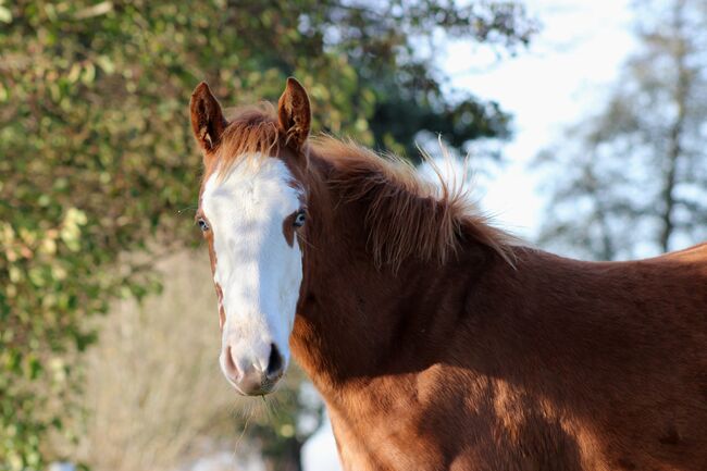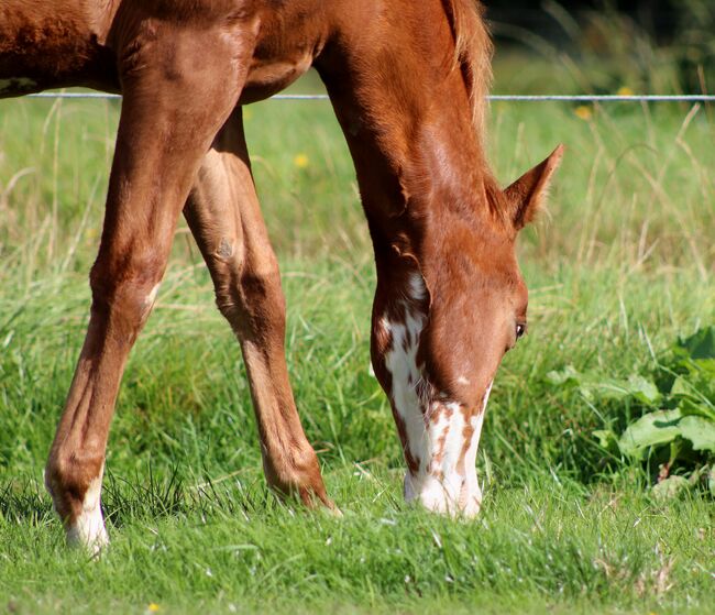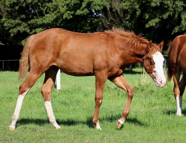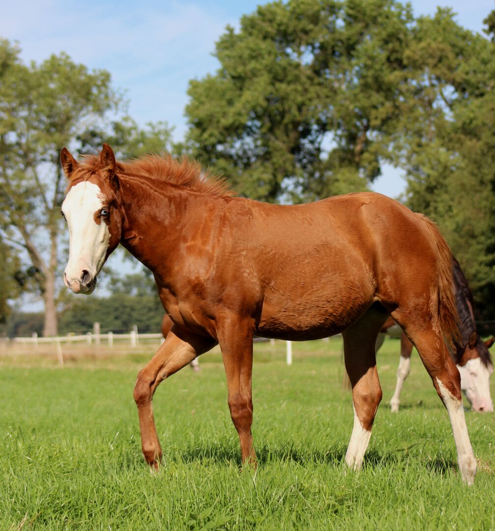Wyjątkowy prospekt do reiningu i hodowli - Lokalizacja: 21682 Stade Custom Splash, urodzona 19 marca 2025 r. przy ostatecznym wzroście ok. 150-153 cm, to niezwykła klacz rasy Sorrel Splash Quarter Horse, która natychmiast przyciąga wzrok. Dzięki uderzającej, wyrazistej twarzy, przyciągającemu wzrok niebieskiemu oku po lewej stronie i częściowo niebieskiemu oku po prawej stronie, a także jej umaszczeniu, przyciąga uwagę wszystkich - prawdziwy koń do zapamiętania. Jej duża, nowoczesna budowa, doskonałe umięśnienie i harmonijna równowaga odzwierciedlają jej naturalny atletyzm i chęć do działania. Wykazuje naturalny talent do reiningu: elegancka kontrola ciała, przyjemny powóz i niezwykła równowaga sprawiają, że jest obiecującą perspektywą dla ambitnych jeźdźców (Non Pro i Open). Ale nie tylko jej wygląd zewnętrzny i potencjał czynią ją wyjątkową - Custom Splash imponuje także charakterem. Jest ciekawska, otwarta i bardzo zorientowana na ludzi. Spokojna, zrelaksowana i przytulaśna, podchodzi do ludzi i szybko uczy się nowych rzeczy. Jest wyszkolona w prowadzeniu w ręku, zaznajomiona ze źrebięcym ABC, przyzwyczajona do przycinania kopyt, pielęgnacji, wizyt u weterynarza i kowala, i od samego początku wykazuje się wzorowym zachowaniem. Dorastając w stadzie, jest zaznajomiona zarówno z boksem, jak i otwartą stajnią i jest karmiona zbilansowaną dietą odchowu i paszą mineralną. 5-panel i Mhym n/n. Jest zarejestrowana w NRHA Germany SSP. Custom Splash jest nie tylko koniem o wybitnym potencjale reiningowym, ale także przyciąga wzrok pierwszorzędnym rodowodem (Custom Crome x Gunners Last Oak). Jest to klacz, która jest pożądana w dzisiejszym sporcie reiningowym i oferuje zarówno ambitnym jeźdźcom, jak i hodowcom idealne połączenie wydajności, charyzmy i typu o dużych ramach. Jest sprzedawana bezpośrednio od hodowcy - wyjątkowy koń, który zainspiruje w sporcie, hodowli lub jako partner rekreacyjny.