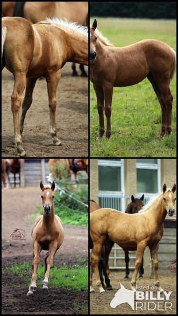 Wymarzona złota klacz rasy palomino Rabicano Quarter Horse z najlepszym rodowodem - CC Snap Me If Yu Can to marzenie na 4 nogach. Przekonuje nie tylko doskonałym rodowodem, ale także bardzo poprawną budową, świetnym ruchem i wreszcie kolorem sierści. ZŁOTY PALOMINO RABICANO. Urodziła się 29.04.23 r., a jej ostateczny wzrost szacuje się na 150 do 152 cm. Klacz ma zorientowany na ludzi, kochający charakter z własnym umysłem i jest łatwa do opanowania w zależności od wieku. Klacz o silnych nerwach i dużej woli zadowolenia. Zna pełne ABC źrebaka. Ma codzienny kontakt z ludźmi. CC Snap Me If Yu Can ma pierwszorzędny rodowód. Jej ojcem jest z powodzeniem pokazywany A Smart Snap, wnuk Smart Little Lena/Snapper Cal Bar. Superior Senior Reining, wielokrotny Bronze Trophy Champion itd. Matką malucha jest Kaila Chic Dun It, wnuczka Smart Chic Olena/Hollywood Dun It. Wielokrotnie plasowała się w klasach Halter. Wszystkie jej źrebięta mają wyjątkowe umaszczenie. Źrebak jest czołowym prospektem Futurity * Reining & Ranch-Riding. Nominowany do DQHA Futurity + opłacony, może być opłacony dla młodych koni NRHA Futurity i EWU na życzenie. Pełna siostra z powodzeniem prezentowanej rocznej klaczy QH CC A Snap Chic Holly Sukcesy: 2023 Dqha Futurity East 1 miejsce, 2 × 1 miejsce Dqha Open Halter Yearling, 2 × 1 miejsce Dqha Amateur Halter Yearling. Lokalizacja: 14822 Brück