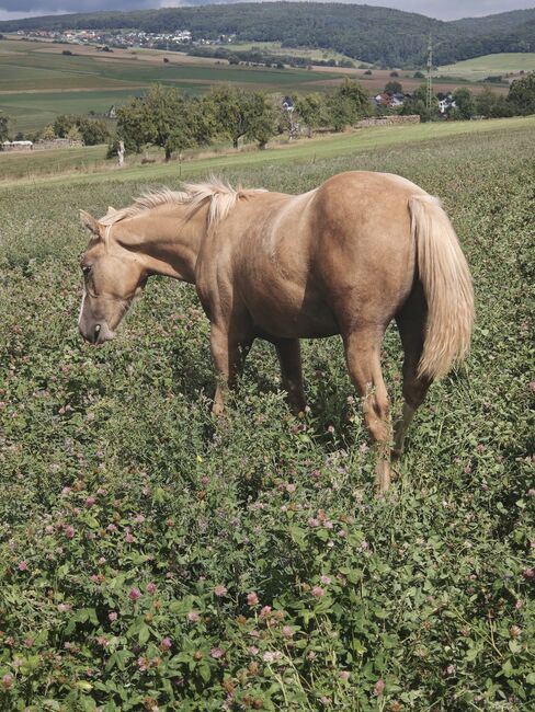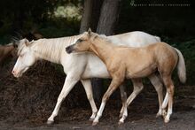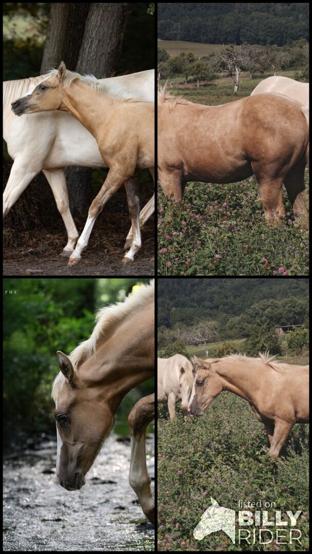 Wymarzony roczniak Palomino - słodki, potulny, gotowy na przygodę - Lokalizacja: 63911 Klingenberg Shining Gun Tari to piękna klacz rasy Quarter Horse, urodzona 04.03.2025, w kolorze Palomino, o ostatecznym wzroście ok. 153 cm. Dokumenty AQHA są dostępne i genetycznie jest 5-panelowa n/n po rodzicach. Młoda klacz przekonuje prawidłową budową, bardzo dobrą podstawą i zrównoważonym umięśnieniem. Jest zdrowa, zaszczepiona, odrobaczona i zadbana. Dorastając w stadzie i w otwartej stajni, wie, jak radzić sobie z weterynarzem i kowalem oraz jest wyszkolona w jeździe w ręku. Shining Gun Tari ma uroczy, ciekawski i zorientowany na ludzi charakter oraz wykazuje typowy dla źrebiąt figlarny, potulny i otwarty temperament. Pierwsza dyscyplina dla młodych koni byłaby teraz idealna, by dalej ją rozwijać. Dzięki dobremu rodowodowi reiningowemu (Colonels Smoking Gun, Shining Spark, Frozen Sailor) może być później wykorzystywana na różne sposoby, czy to jako koń pokazowy, czy jako partner rekreacyjny. Będzie dorastać w najlepszych warunkach i z mnóstwem miłości i zostanie sprzedana bezpośrednio od hodowcy w najlepsze ręce.