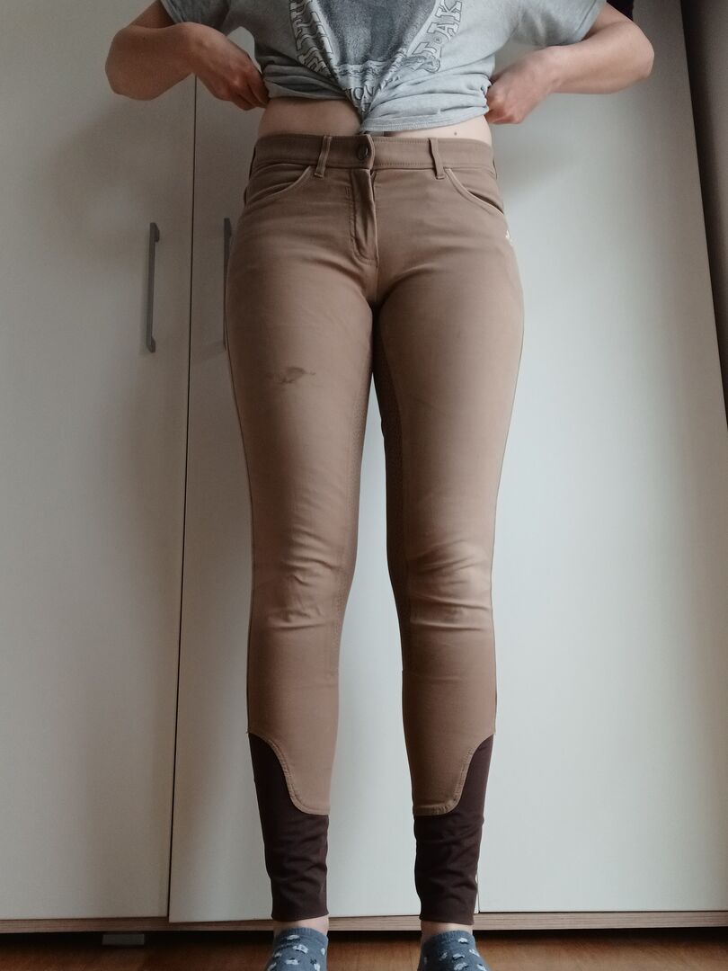 WYPRZEDAŻ Bryczesy Felix Bühler jasnobrązowe - Sprzedam parę bryczesów w kolorze jasnobrązowym / nugatowym, rozmiar L (dokładniej 40 rozmiar długi = 80), dużo noszone. Pełne siedzisko z silikonowym chwytakiem, który jest również dość przyczepny. Przed sprzedażą można je ponownie wyprać.