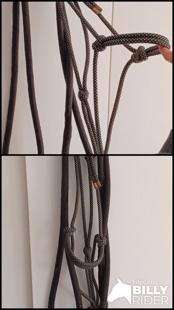 Halter węzełkowy jest czarno-srebrny, długa lina do pracy na ziemi jest czarna z brązową skórzaną grzechotką i karabinkiem, ok. 3,80 m.