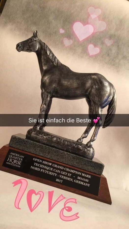 Technique Can Get It - wspaniała klacz rasy Quarter Horse, rocznik 2014 o wzroście 165 cm, w typie stojącego myśliwego, z pierwszorzędnym, starym rodowodem. Zoe była pokazywana z sukcesami w młodym wieku w klasach Halter oraz pod siodłem w klasach młodych koni EWU. Została zaprezentowana jako klacz hodowlana na pokazie klaczy Q22 i otrzymała dobre oceny i jest zakwalifikowana do księgi klaczy DQHA 1. Do tej pory urodziła 2 wspaniałe źrebaki. Oba źrebięta były źrebiętami premium z doskonałymi ocenami i oba zostały już czempionami Halter Futurity. (Można je obejrzeć na stronie). Klacz ma bardzo dobre wyszkolenie westernowe i jest również dobra w terenie. Ze względu na źrebięta i brak czasu, w ostatnich latach była rzadko jeżdżona. Można ją jednak natychmiast ponownie wyszkolić. Każdy, kto szuka wspaniałego konia do sportu, jako uroczego towarzysza wypoczynku i do hodowli, znajdzie w niej najlepszego partnera.