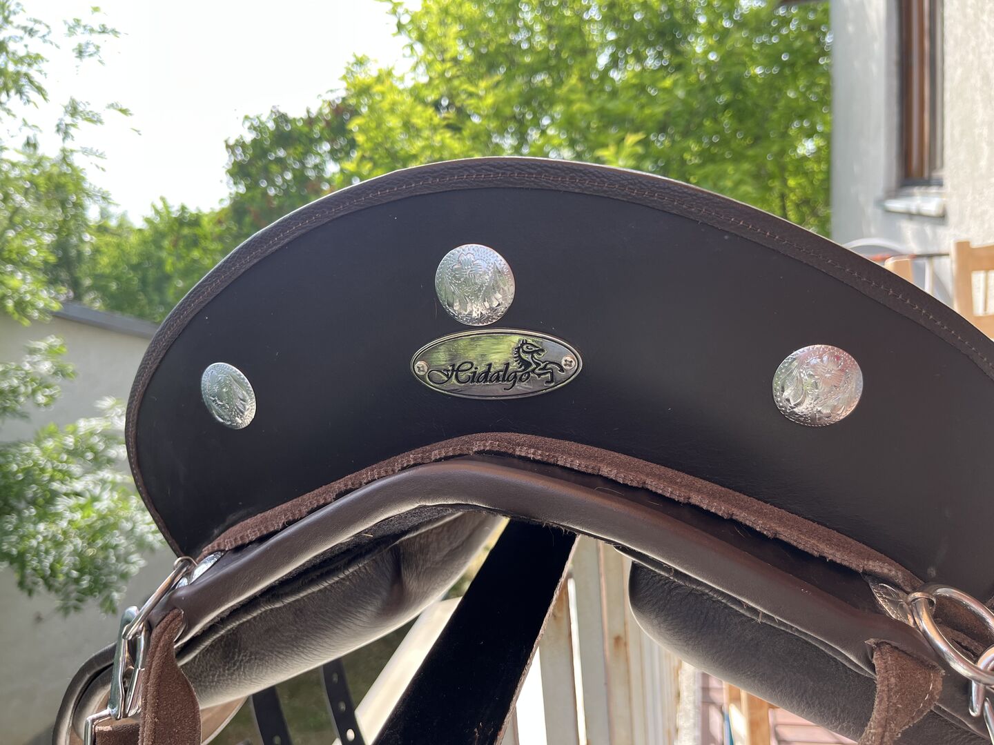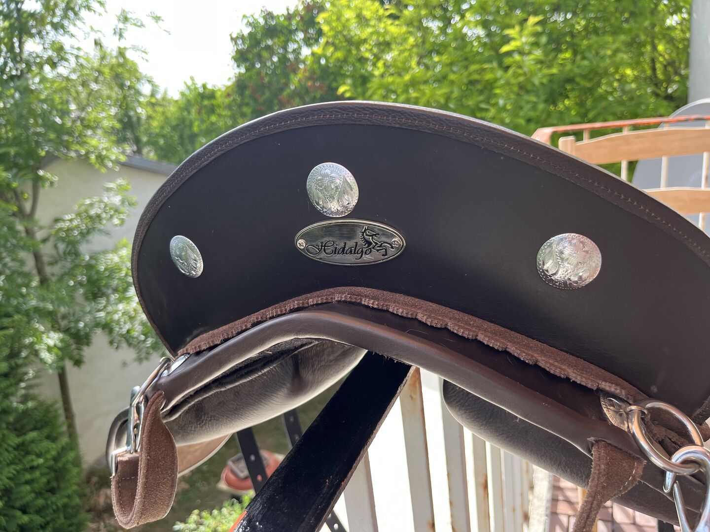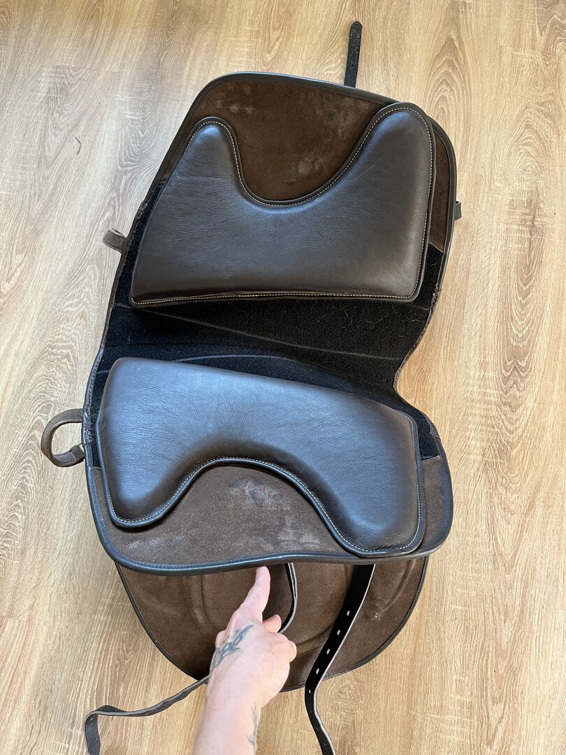 - Obwód: V-girth, paski do krótkiego popręgu, mogą być niezapętlone. - otwarte strzemiona - brak łęku, siodło dopasowuje się do grzbietu konia i rośnie wraz z nim - Panele na rzepy - możliwość regulacji przez samego Hidalgo. Wycieczki 2-3 razy po Niemczech i mają swoich ekspertów, którzy chętnie to zrobią. - w tym panele na rzepy i podkładki pod siodło - W komplecie popręg księżycowy 65 cm