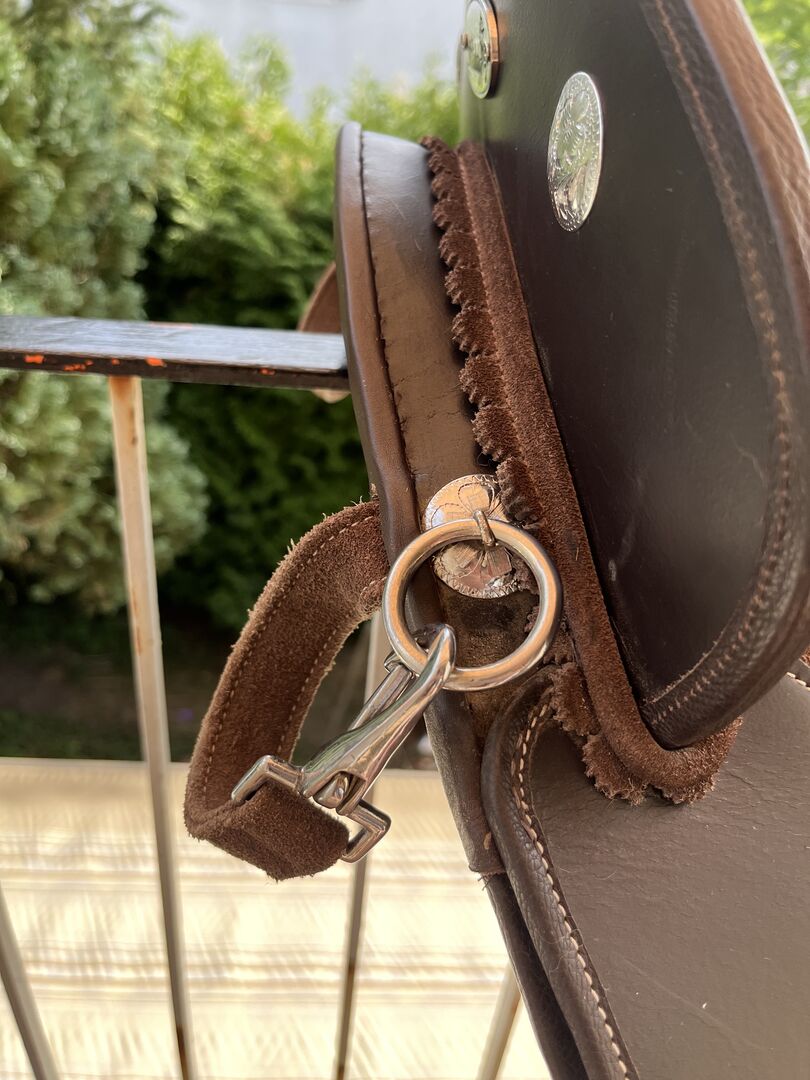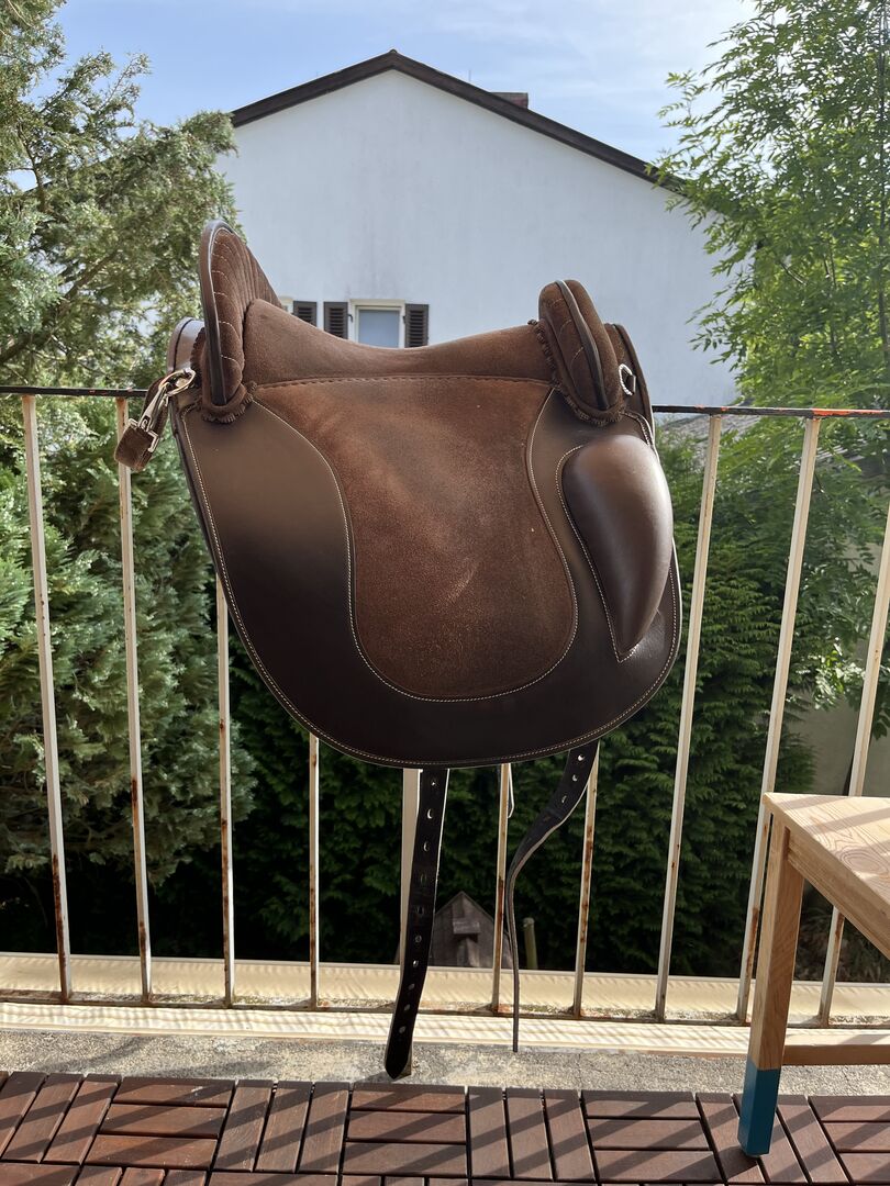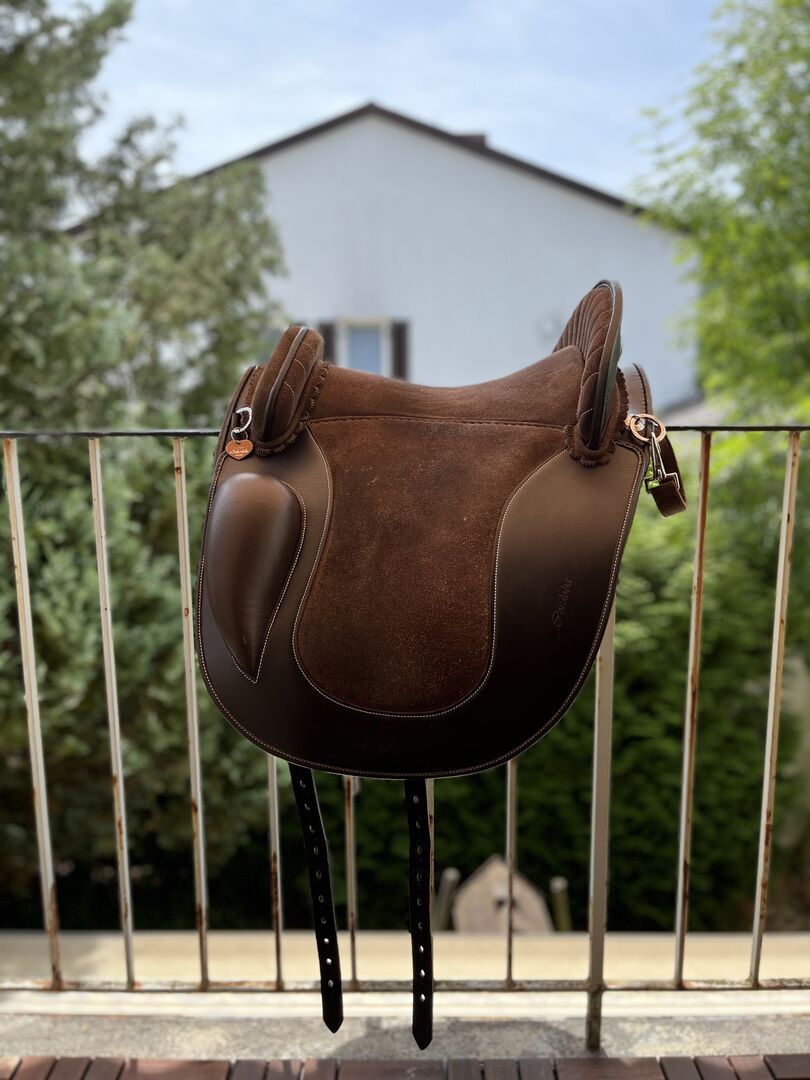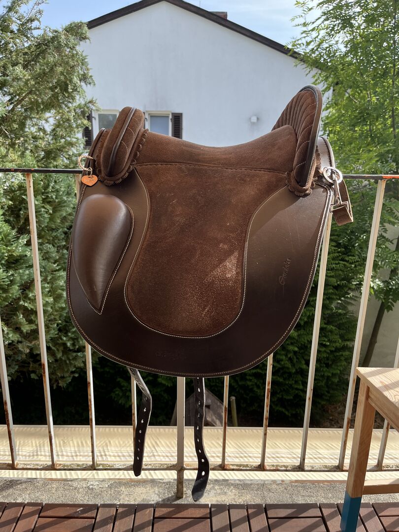 Siodło kupiłam w zeszłym roku w listopadzie i jest jak nowe. Oczywiście ma niewielkie ślady użytkowania, ponieważ używałam go codziennie. Jednak jest to zaleta siodła, ponieważ najpierw trzeba "włamać się" do siodła i skórzanego drzewa, tj. materiał mięknie tylko podczas użytkowania i zawsze dostosowuje się do konia. To znaczy do każdego konia. Jeśli jest często używane, jest miękkie, a jeśli zostanie założone na innego konia, ponownie się dostosowuje. Myślę, że to naprawdę fajne. :-) Teraz, kiedy jeździ się na nim miękko, świetnie nadaje się również do treningu młodego konia.