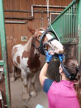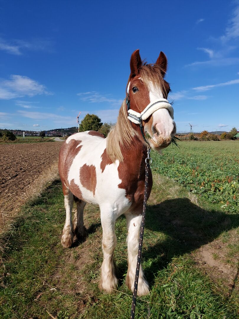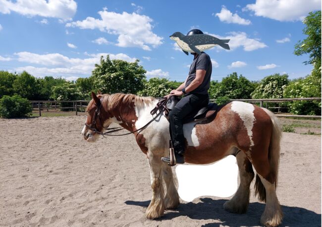 Zabawny wałach Tinker Robbie - Robbie (Rob Roy EG) to irlandzki wałach rasy Tinker urodzony w kwietniu 2021 roku Waga 553,5 kg i wzrost 148 cm zostały zmierzone w 2025 roku. Filmy i dalsze posty można znaleźć na profilu Robbiego na Instagramie "verkaufspferdrobbie" Obecnie mieszka w stadzie wałachów w stajni otwartej/aktywnej, z automatycznym karmieniem sianem, co jest dla niego bardzo dobre. Przed przeprowadzką do obecnej stajni przebywał również w mieszanym stadzie otwartym, gdzie bez problemu się zaaklimatyzował. Jego ranga jest średnia, nie lubi być odpychany, ale też nikogo nie odpędza, jest po prostu wyluzowanym typem. Głównie lonżowaliśmy go we wszystkich chodach z siodłem lub bez, wykonywaliśmy pracę na drągach, pracę z ziemi i trening klikerowy. Wciąż rośnie i dlatego został tylko ostrożnie wprowadzony, głównie na spacerze. Robi to jednak na ujeżdżalni, w hali i w terenie. W 2025 roku został wyposażony w westernowe siodło D&P Quantum o westernowym wyglądzie, uzdę z bitem i bez (głównie jeżdżoną bez), podkładkę bareback i inny sprzęt jest również dostępny i zostanie przekazany Robbiemu.